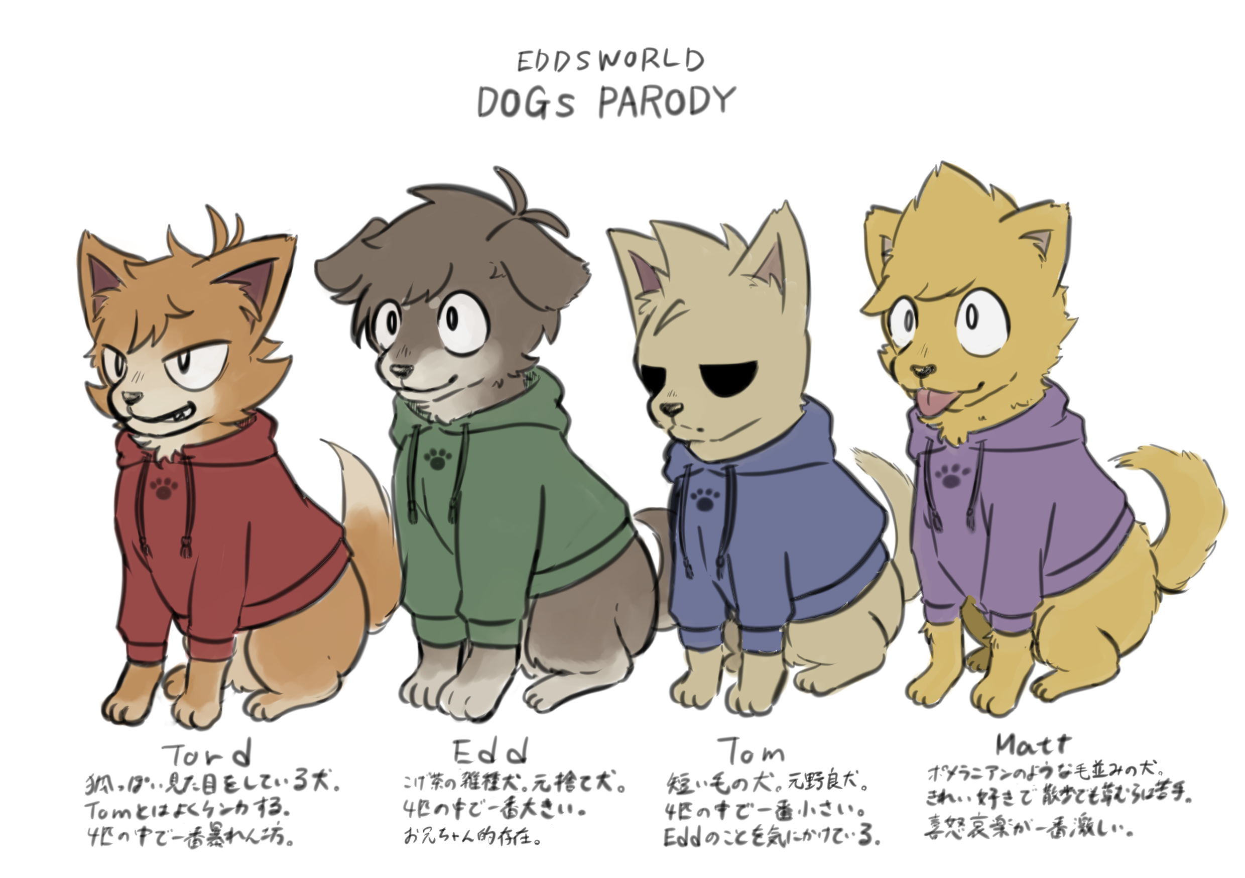 animal animal_focus animal_with_hair animalization antenna_hair bilingual_text blue_hoodie brown_dog brown_fur character_name clothed_animal commentary_request copyright_name dog drawstring edd_(eddsworld) eddsworld english_text flat_color green_hoodie highres hollow_eyes hood hood_down hoodie kashimiato long_sleeves matt_(eddsworld) mixed-language_text no_humans partial_commentary purple_hoodie red_hoodie short_hair simple_background sitting spiked_hair swept_bangs tom_(eddsworld) tongue tongue_out tord_(eddsworld) translated white_background yellow_fur