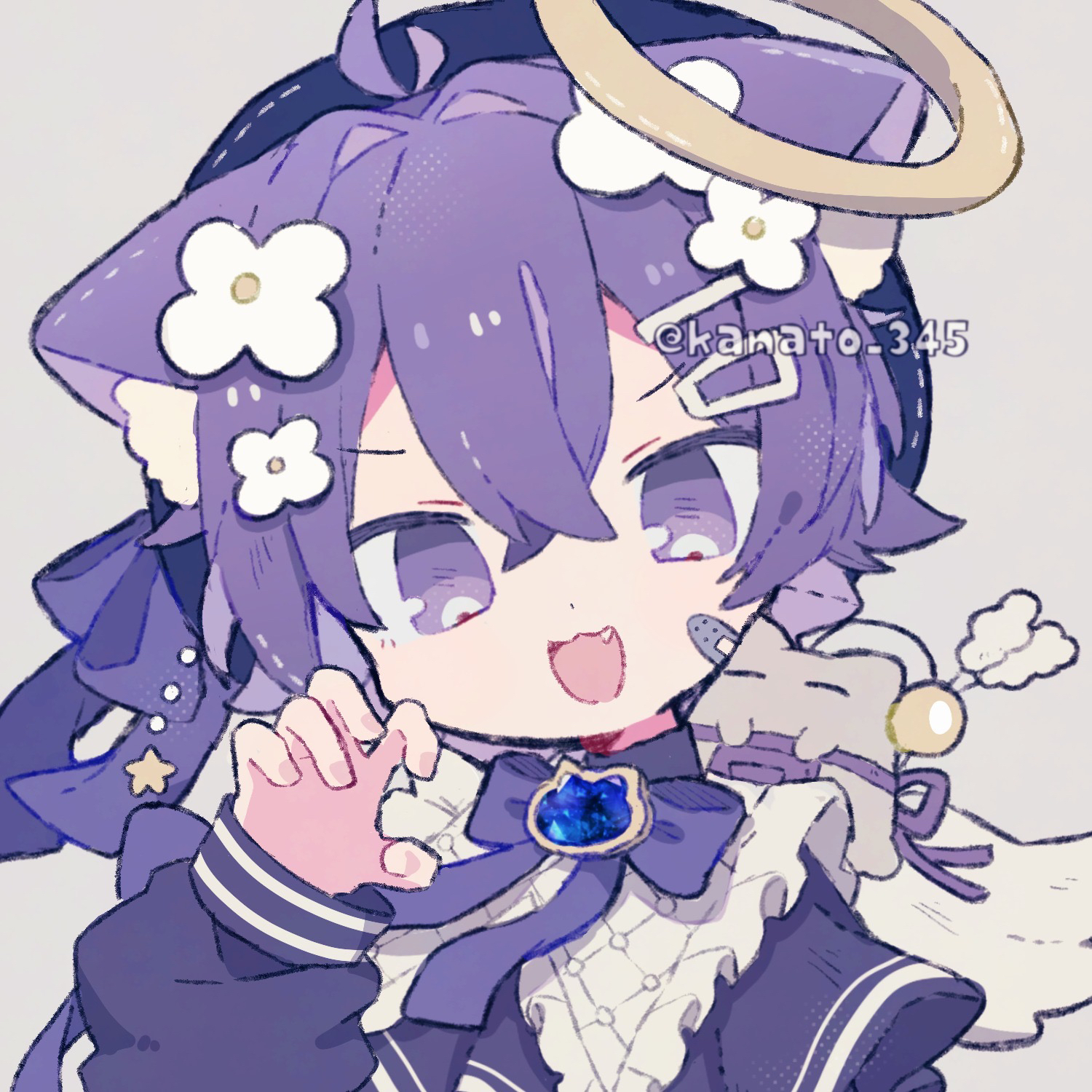 1boy :3 :d ahoge animal_ear_fluff animal_ears bandaid bandaid_on_cheek bandaid_on_face blue_hat bow bowtie cat_boy cat_ears claw_pose commentary dot_nose double-parted_bangs fang hair_between_eyes hair_intakes halo hand_up hat highres kanamochi_kanato long_sleeves looking_at_viewer male_focus open_mouth original portrait purple_bow purple_bowtie purple_eyes purple_hair purple_shirt shirt short_hair simple_background smile solo twitter_username