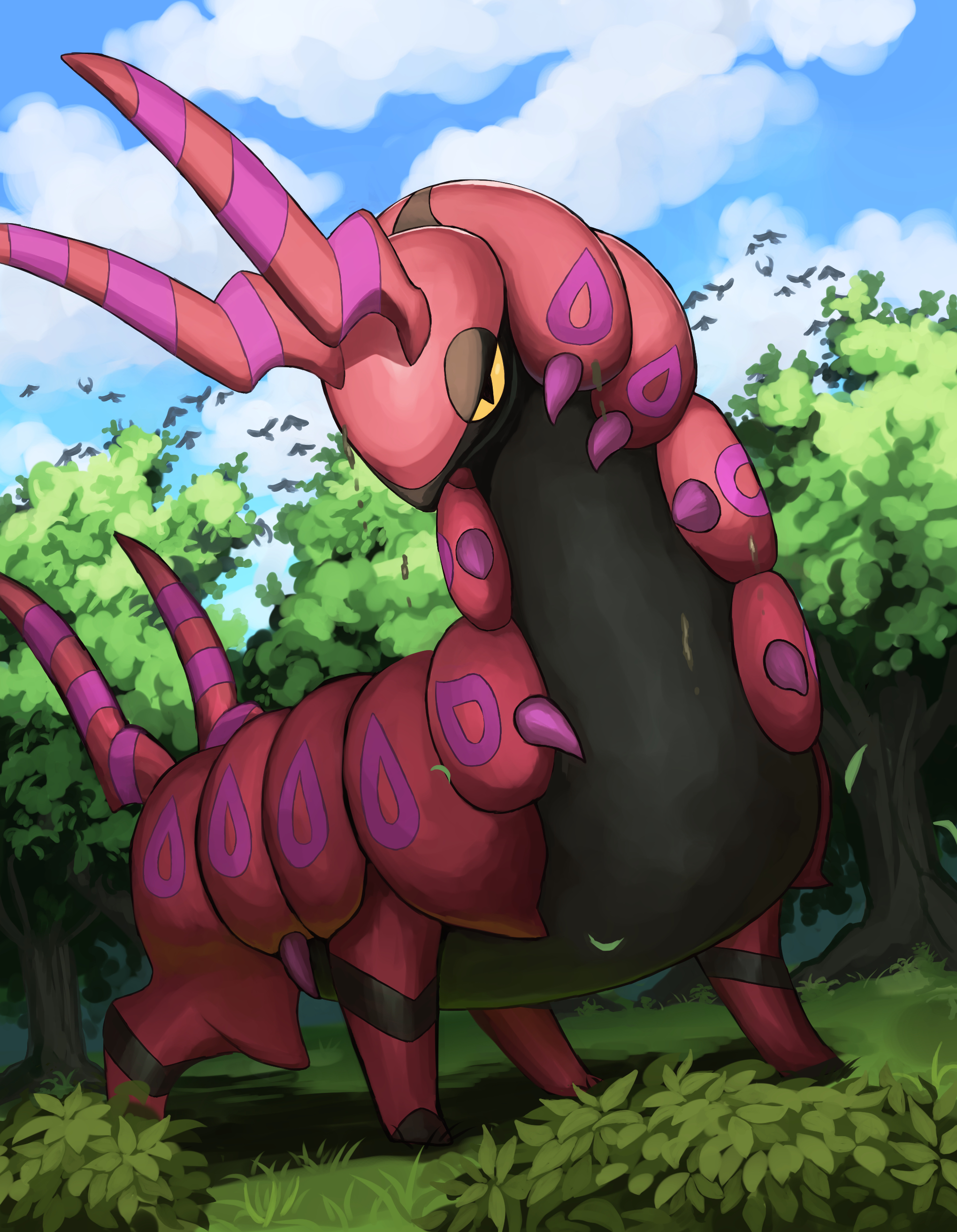 absurdres cloud commentary_request day falling_leaves gen_5_pokemon grass highres jira_(ziraiya26) leaf looking_down nintendo no_humans outdoors pokemon pokemon_(creature) pokemon_focus scolipede sky solo standing tree yellow_eyes