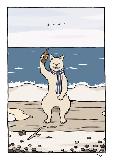 2006 bad_id beach beer_bottle blue_scarf border bottle branch closed_eyes commentary dated day furry grey_sky holding holding_bottle koike_sadaji log ocean on_log open_mouth original outdoors pebble rock sand scarf signature sitting sitting_on_log sky striped_clothes striped_scarf two-tone_scarf white_border white_fur white_scarf