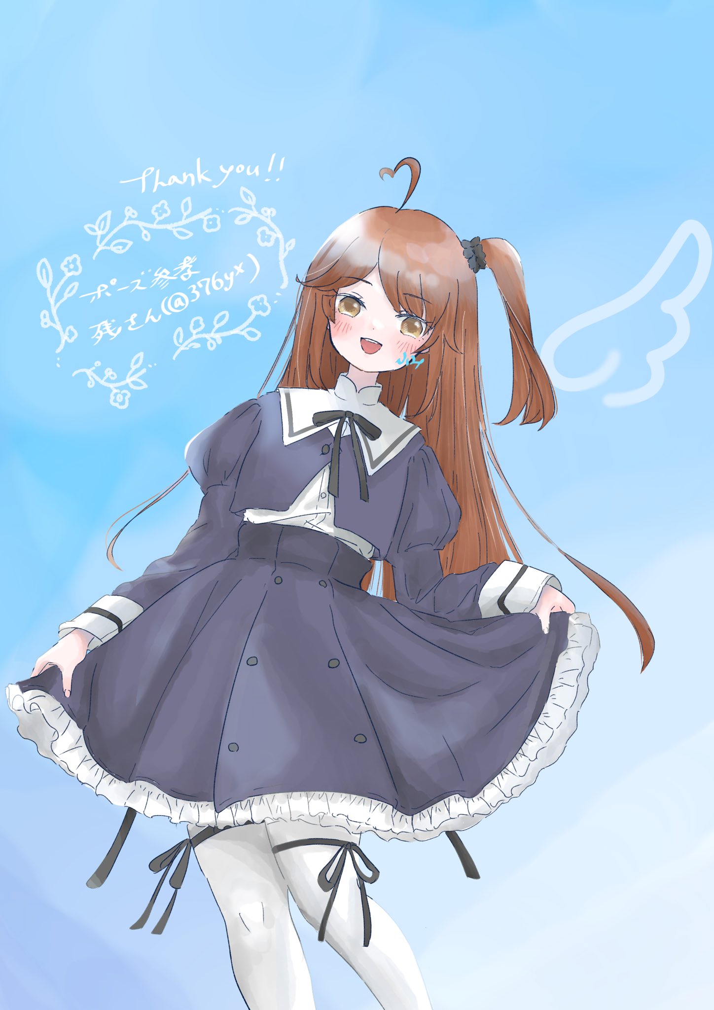 1girl :d ahoge assault_lily black_ribbon black_scrunchie black_skirt blue_sky blush brown_eyes brown_hair commentary cropped_jacket day drawn_wings feet_out_of_frame frilled_skirt frills fumi_(fumifumi3axl) hair_ornament hair_scrunchie hand_up heart heart_ahoge high-waist_skirt highres juliet_sleeves leaning_to_the_side leg_ribbon long_hair long_sleeves looking_at_viewer neck_ribbon one_side_up open_mouth outdoors pantyhose puffy_sleeves ribbon school_uniform scrunchie shirt skirt skirt_hold sky smile solo standing takasuga_tsukushi teeth thank_you thigh_ribbon translation_request upper_teeth_only very_long_hair white_pantyhose white_shirt yurigaoka_girls_academy_school_uniform