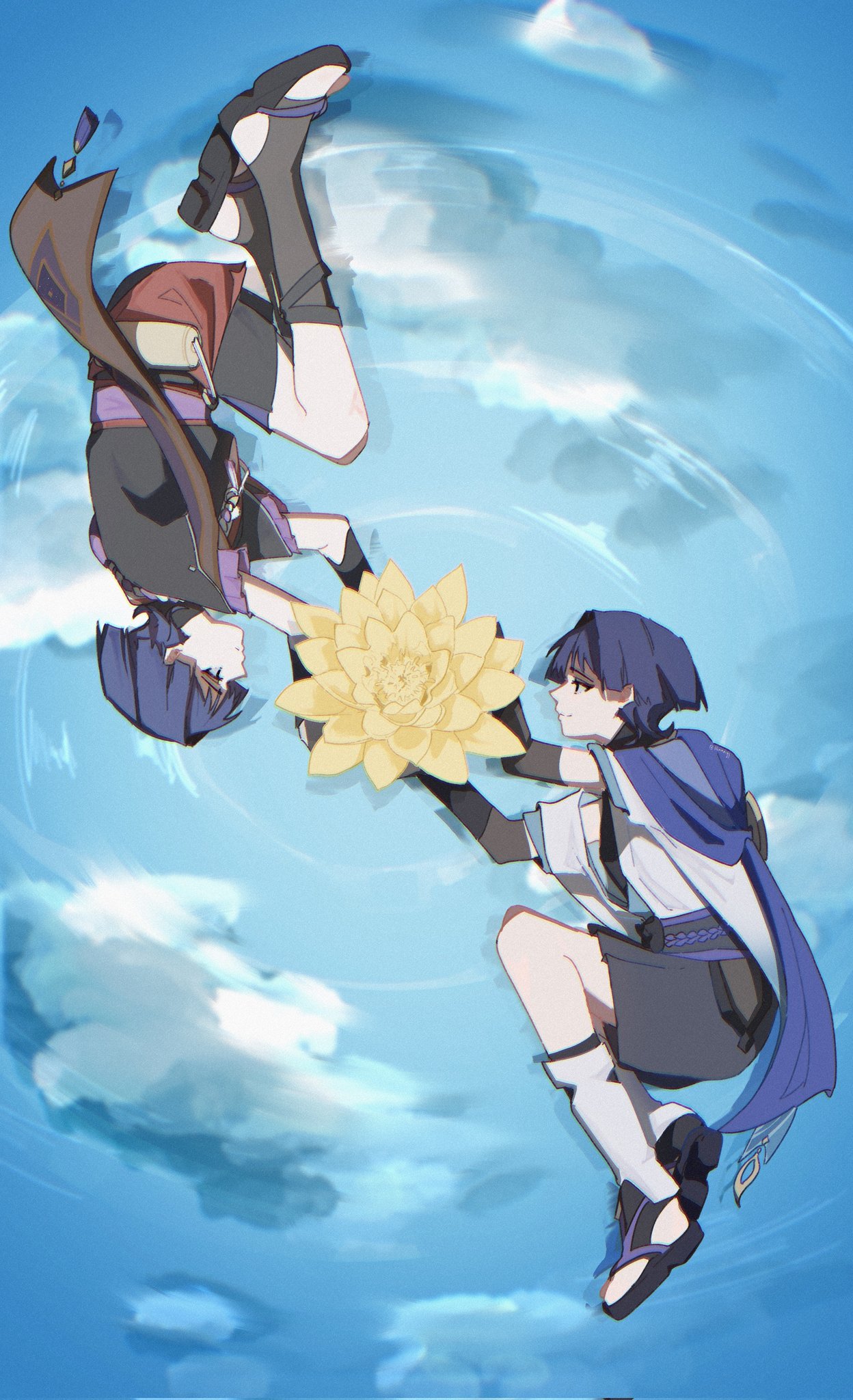 2boys armor arms_up belt black_belt black_bodysuit black_bow black_bridal_gauntlets black_eyes black_kimono black_sandals black_shorts black_sleeves blue_cape blue_sky blue_sleeves blunt_ends bodysuit bow bridal_gauntlets cape closed_mouth clothing_cutout cloud cloudy_sky dual_persona flower from_side furisode genshin_impact hakama hakama_shorts highres hip_vent holding holding_flower japanese_armor japanese_clothes kimono kote kurokote layered_shorts layered_sleeves leg_warmers lilixaxafj looking_at_another lotus lying multiple_boys on_liquid on_side pleated_shorts profile purple_hair purple_rope purple_sash purple_shorts purple_sleeves red_sash reflection reflective_liquid ripples rope sandals sash scaramouche_(genshin_impact) short_sleeves shorts sky smile split_mouth stirrup_legwear tassel toeless_legwear wanderer_(genshin_impact) white_leg_warmers white_sleeves wispy_bangs yellow_flower zouri
