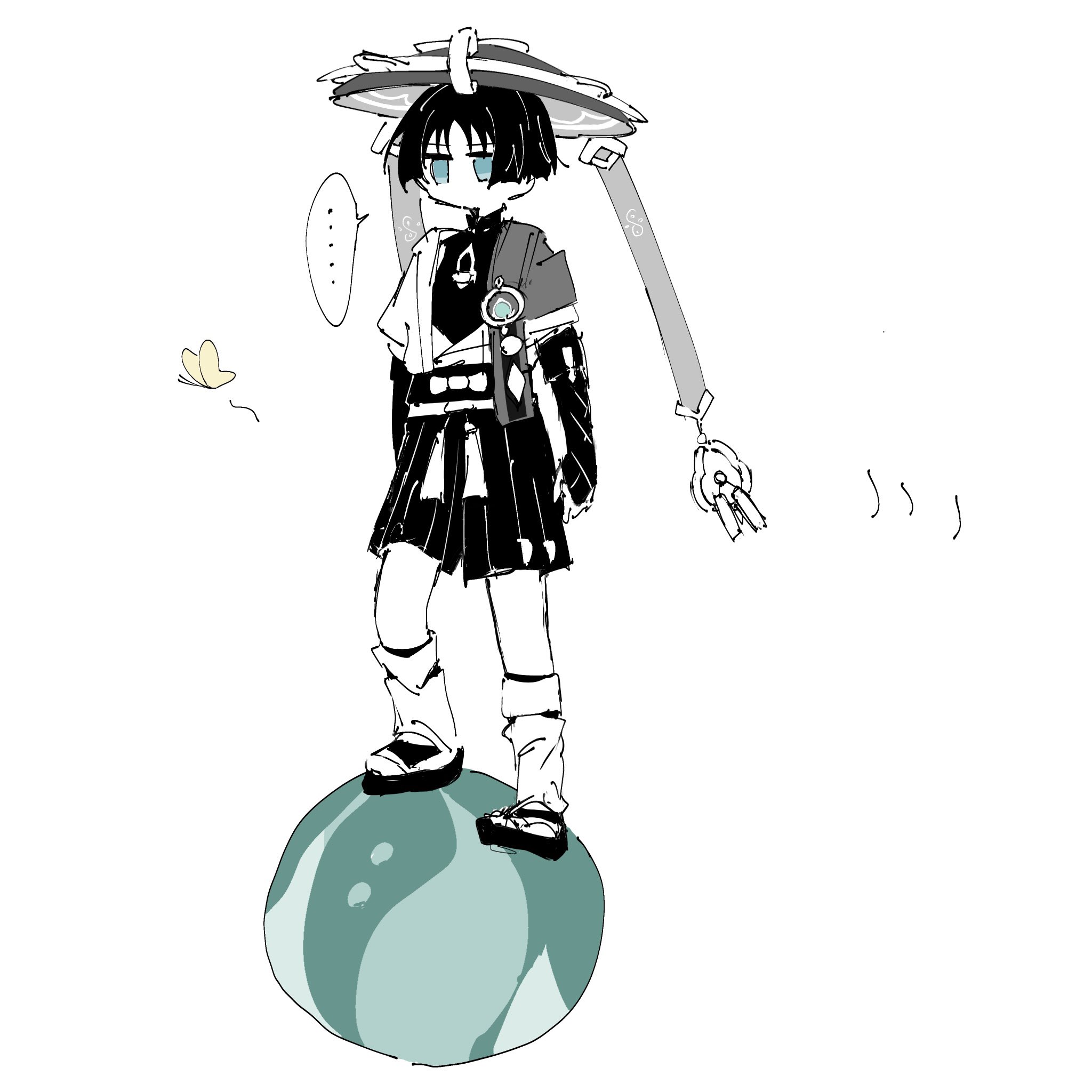 ... 1boy amhr_46 aqua_eyes aqua_gem armor arms_at_sides balancing_ball ball blunt_ends bodysuit bow bridal_gauntlets bug butterfly cape choppy_bangs feathers full_body gem genshin_impact greyscale hakama hakama_shorts hat highres insect japanese_armor japanese_clothes jingasa jitome juban kimono kote layered_sleeves leg_warmers male_focus mandarin_collar monochrome no_mouth open_clothes open_kimono pleated_shorts pom_pom_(clothes) sandals sash scaramouche_(genshin_impact) short_sleeves shorts shoulder_peek solo spoken_ellipsis spot_color tassel toeless_legwear vision_(genshin_impact) wanderer_(genshin_impact) white_background yellow_butterfly zouri