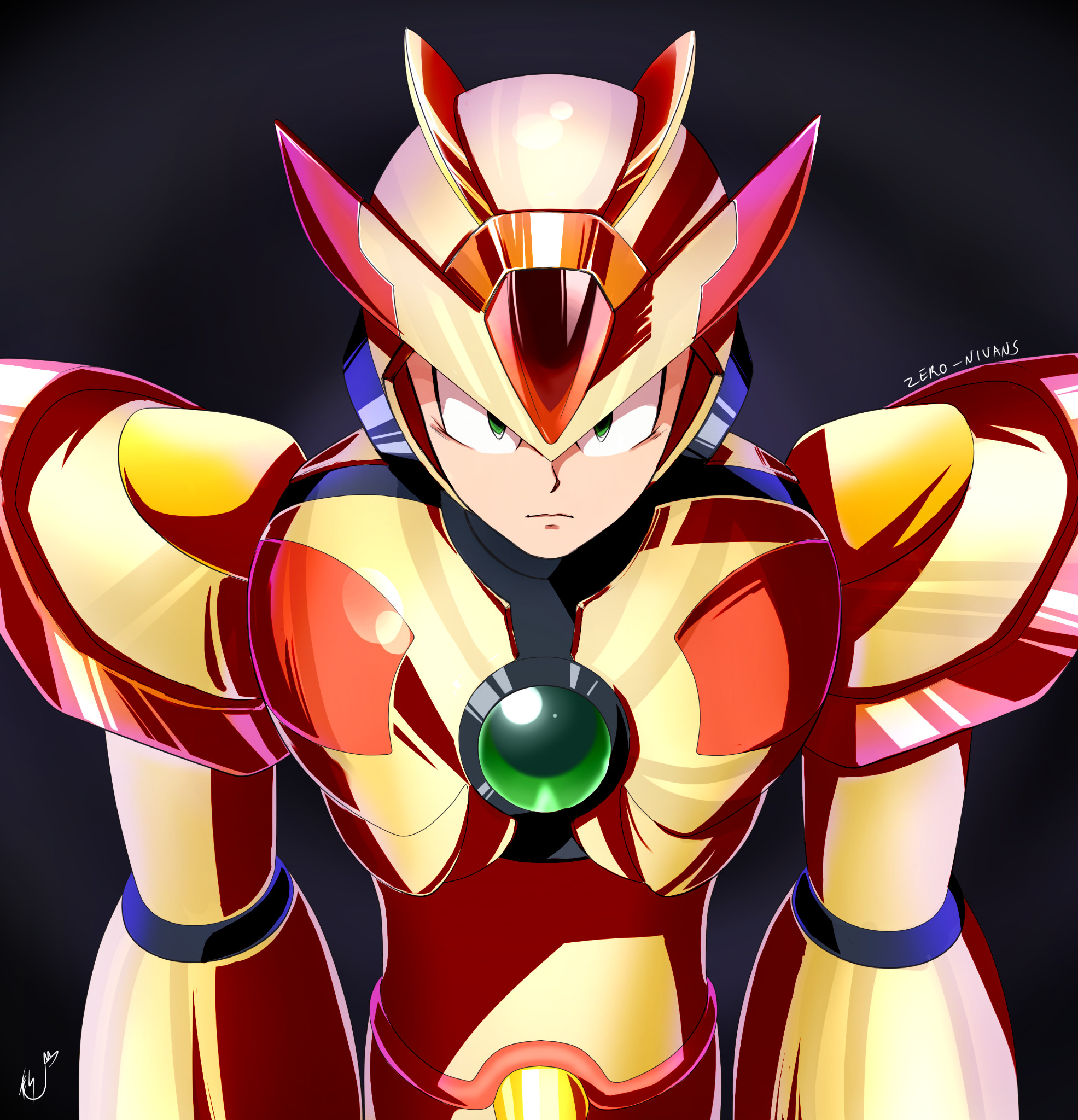 1boy android armor artist_name black_background chest_jewel forehead_jewel from_below gold_armor gold_helmet highres looking_at_viewer male_focus mega_man_(series) mega_man_x_(series) robot robot_ears shoulder_armor signature simple_background solo solo_focus third_armor_x_(mega_man) upper_body x_(mega_man) znivans