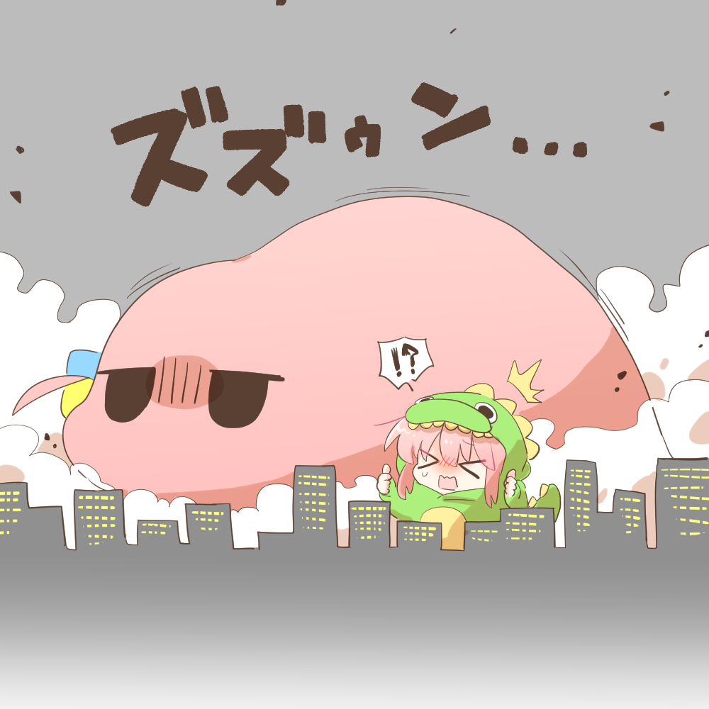 !? >_< 1girl ^^^ bocchi_the_rock! chibi chibi_only city closed_eyes commentary_request cube_hair_ornament dinosaur_costume dual_persona giant gotoh_hitori gotoh_hitori_(tsuchinoko) hair_ornament jitome open_mouth pink_hair rebecca_(keinelove) spoken_interrobang