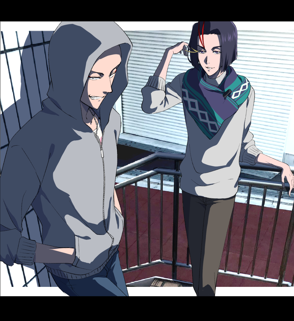 2boys against_railing asymmetrical_eyelashes ayasegawa_yumichika bald black_hair bleach blue_pants brown_pants casual commentary_request denim grey_hoodie grey_shirt grin hood hoodie jeans jewelry letterboxed lido_an0 madarame_ikkaku male_focus multiple_boys necklace pants purple_eyes railing scarf shirt smile