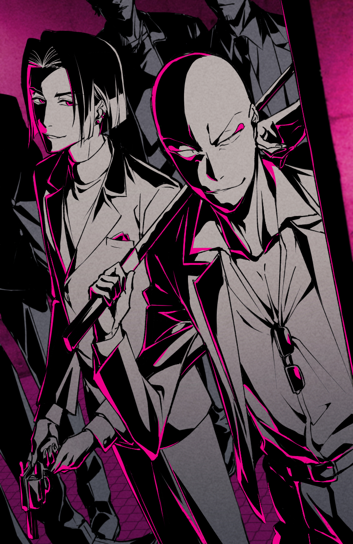5boys ayasegawa_yumichika bald bleach commentary_request ear_piercing earrings eyeliner eyewear_hang facial_hair formal_clothes goatee gun handgun holding holding_gun holding_sword holding_weapon jewelry lido_an0 limited_palette madarame_ikkaku makeup male_focus multiple_boys necktie pectoral_cleavage pectorals piercing pink_eyeliner pink_eyes revolver smile suit sunglasses sword turtleneck unworn_eyewear weapon