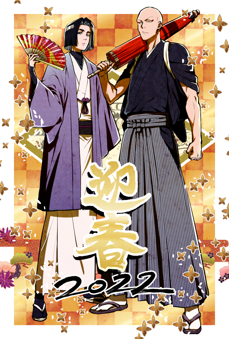 2022 2boys ayasegawa_yumichika bald black_hair black_socks bleach blue_haori commentary_request eyeliner folded_umbrella folding_fan grey_hakama hakama hand_fan haori holding holding_fan holding_umbrella japanese_clothes kimono lido_an0 madarame_ikkaku makeup male_focus multiple_boys sandals socks striped_hakama toned toned_male umbrella vertical-striped_hakama white_kimono white_socks