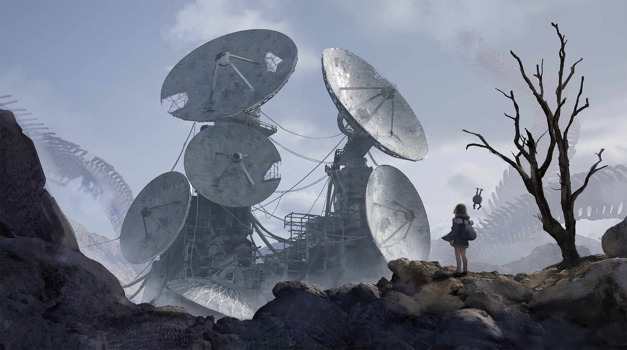 1girl backpack bag bare_tree commentary day drone facing_away highres momokurianzu original outdoors parabolic_antenna robot ruins scenery science_fiction tree