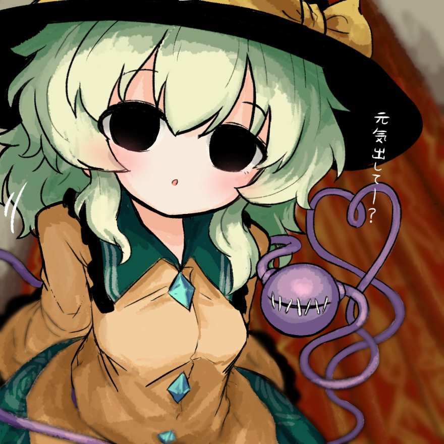 1girl :o black_eyes black_hat blurry bow buttons collared_shirt commentary_request diamond_button floral_print floral_print_skirt frilled_shirt_collar frilled_sleeves frills from_above green_hair green_skirt hat hat_bow heripantomorrow komeiji_koishi medium_hair parted_lips print_skirt shirt skirt solo third_eye touhou translation_request yellow_bow yellow_shirt