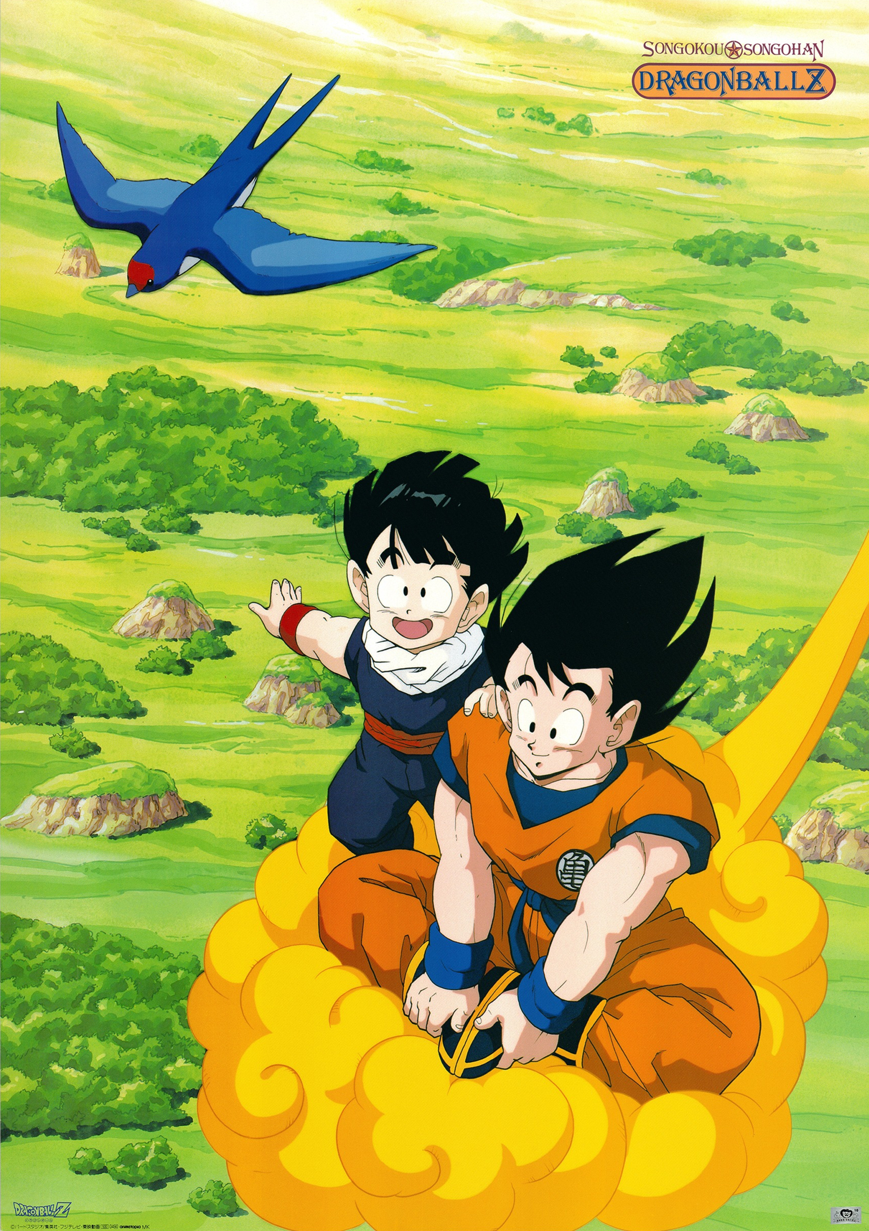 1990s_(style) 2boys absurdres bird black_hair boots character_name child cosplay dated dougi dragon_ball dragonball_z father_and_son floating_hair flying_nimbus from_above hand_on_another's_shoulder highres male_focus multiple_boys muscular muscular_male non-web_source official_art open_mouth outdoors outstretched_arm poster_(medium) retro_artstyle scan short_hair sitting smile son_gohan son_goku son_goku_(cosplay) standing wristband