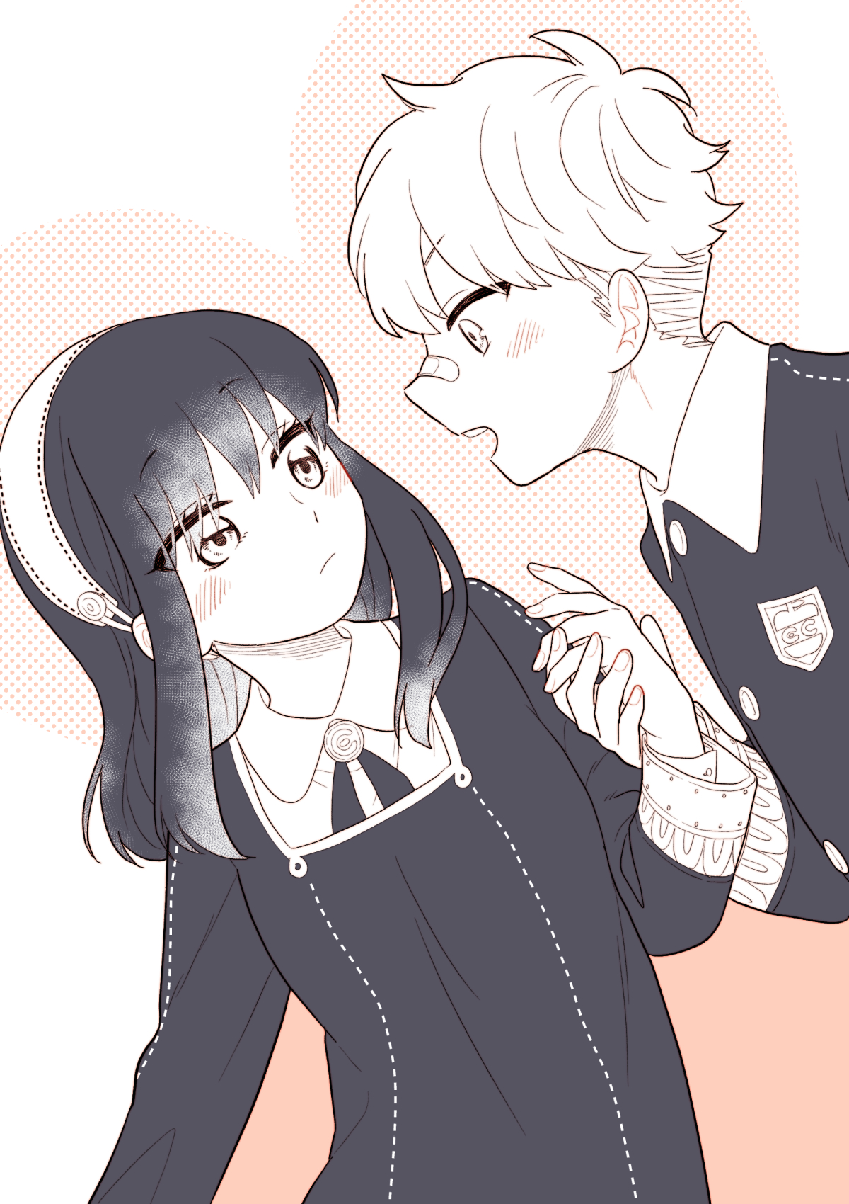 aged_down bandaid bandaid_on_face bandaid_on_nose ben-day_dots blush buttons child closed_mouth collared_shirt commentary_request dress eden_academy_school_uniform greyscale_with_colored_background hairband heart heart_background highres holding_hands jacket long_sleeves looking_at_another medium_hair open_mouth profile school_uniform screentones shirt short_hair spy_x_family sunbo_zatta twilight_(spy_x_family) upper_body very_short_hair yor_briar