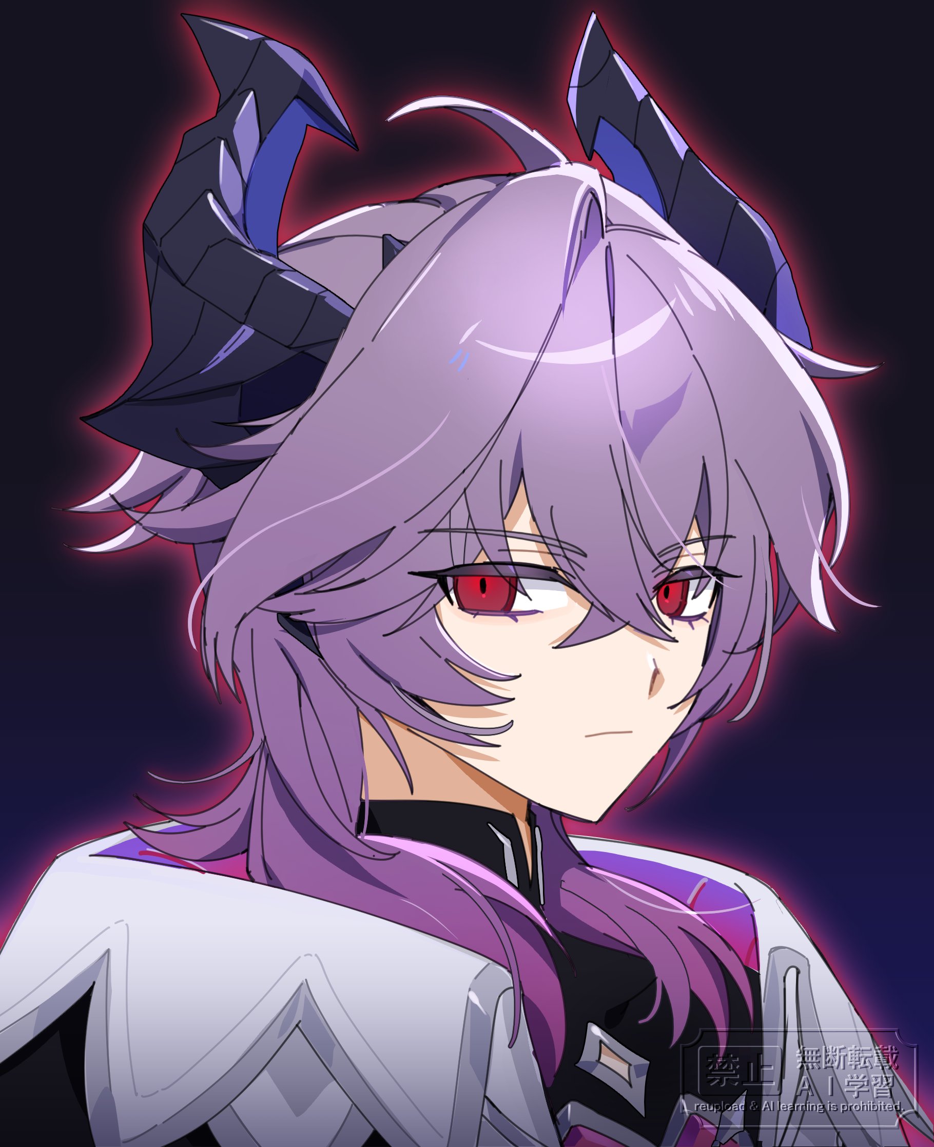 1boy black_horns black_shirt closed_mouth colored_eyelashes commentary_request crossed_bangs dark_background dragon_boy dragon_horns durin_(genshin_impact) genshin_impact hair_between_eyes highres horns korean_commentary looking_at_viewer male_focus medium_hair purple_hair red_eyes shirt sia37068010 simple_background solo upper_body watermark