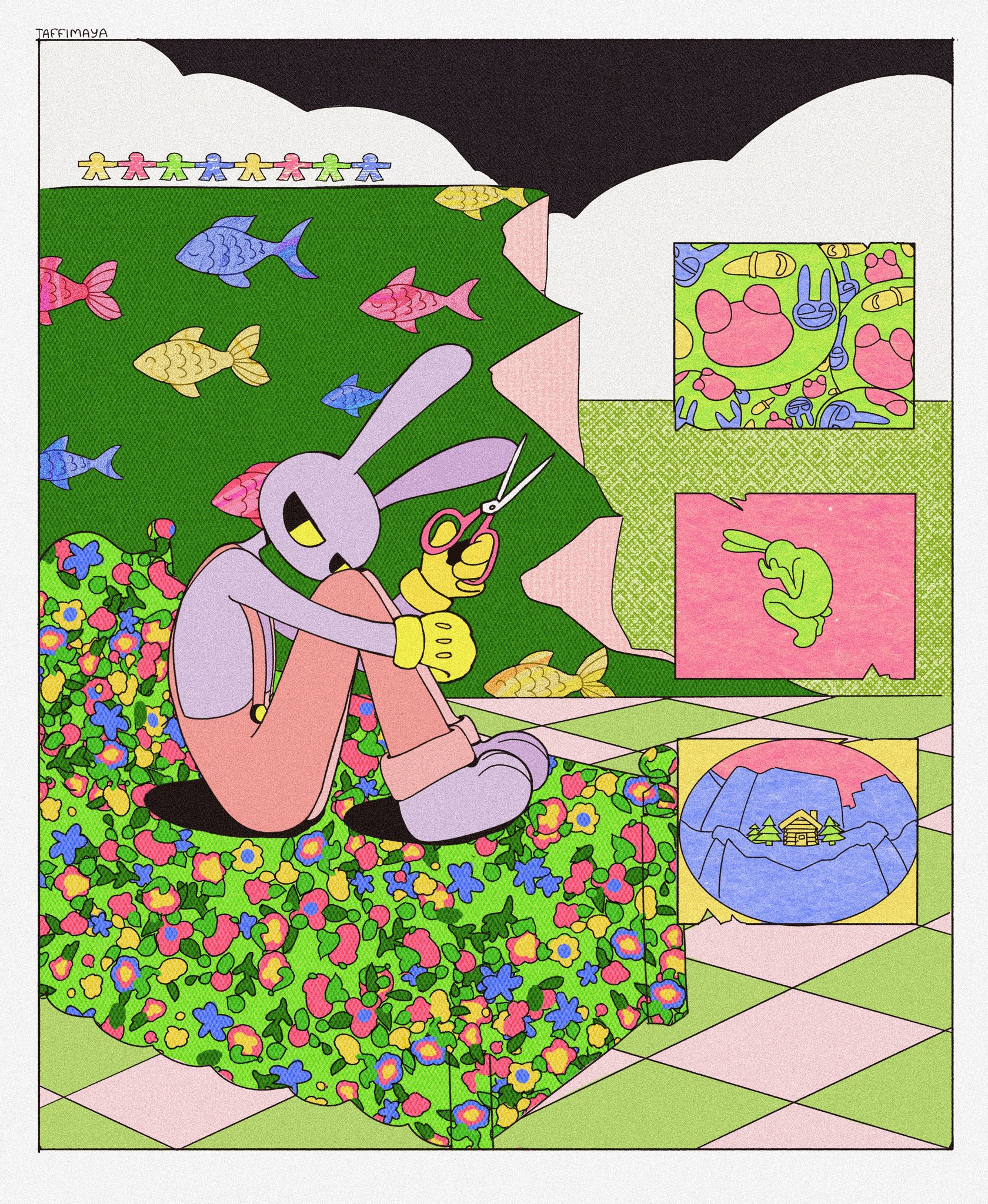 1boy animal_ears animal_feet artist_name barefoot black_eyes black_sky border checkered_floor cloud colored_sclera colored_skin commentary english_commentary fish flower furry furry_male gloves highres holding holding_scissors house jax_(the_amazing_digital_circus) looking_to_the_side male_focus overalls pink_overalls purple_skin rabbit_boy rabbit_ears scissors sitting sky solo surreal taffimaya the_amazing_digital_circus tree white_border yellow_gloves yellow_sclera