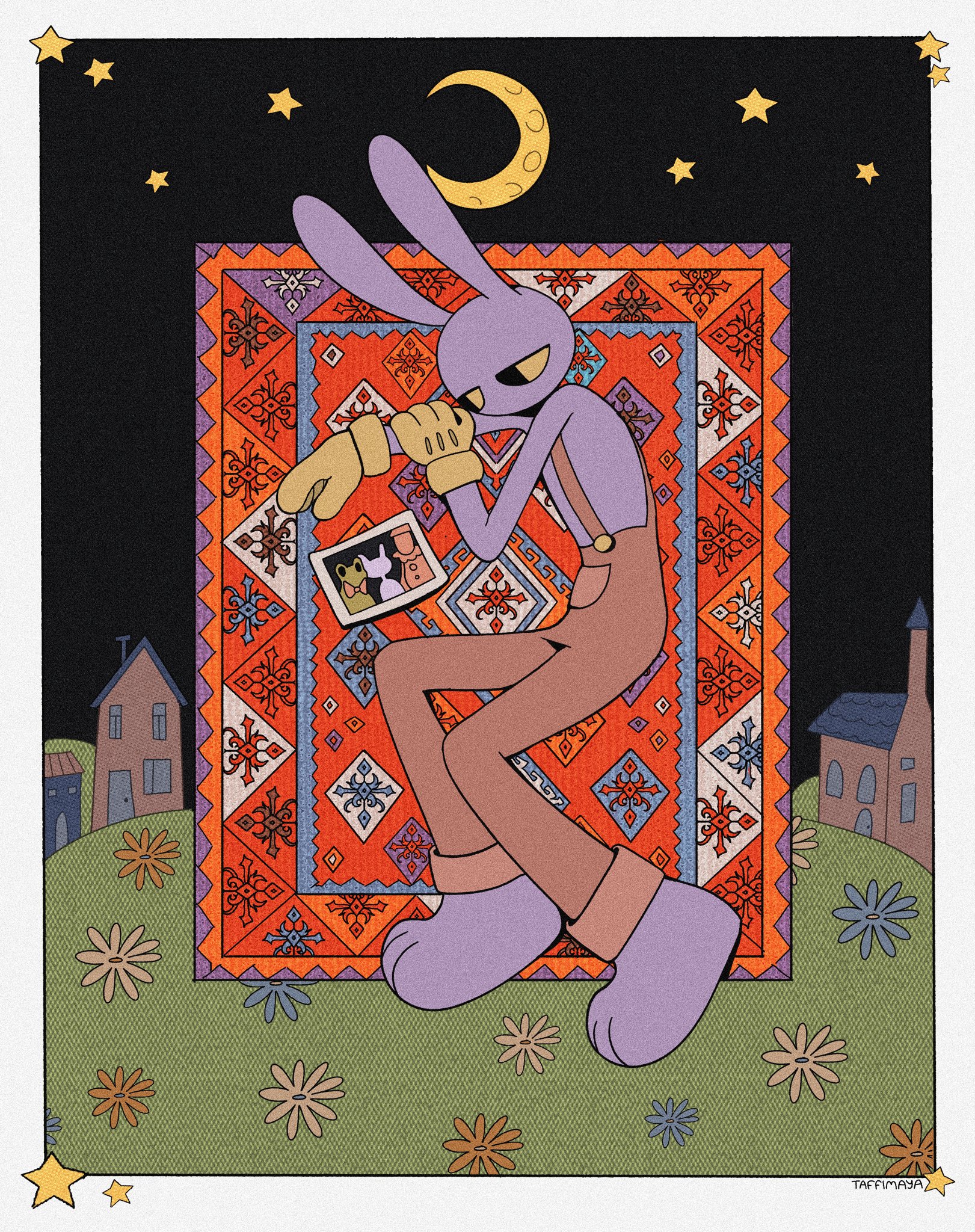 1boy animal_ears animal_feet barefoot black_eyes black_sky blue_flower border building carpet colored_sclera colored_skin commentary english_commentary film_grain flower furry furry_male gloves grass highres house jax_(the_amazing_digital_circus) kaufmo_(the_amazing_digital_circus) male_focus moon night no_mouth no_nose orange_flower orange_overalls overalls purple_skin rabbit_boy rabbit_ears ribbit_(the_amazing_digital_circus) sky star_(sky) star_(symbol) taffimaya the_amazing_digital_circus white_border yellow_flower yellow_gloves yellow_sclera