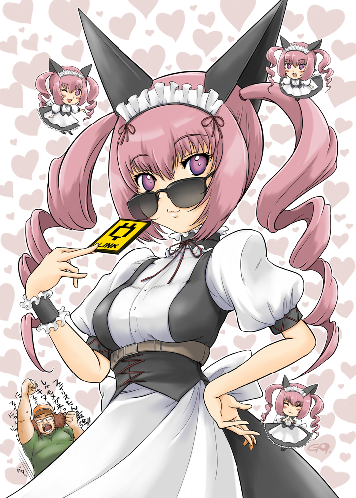 1boy 1girl akiha_rumiho animal_ear_hairband animal_ears belt_around_waist belt_buckle brown_hair buckle card cat_ears chibi chibi_inset commentary_request drill_hair fake_animal_ears fat fat_man fist_bump frills get9 green_shirt hairband hashida_itaru hat holding holding_card long_hair looking_at_viewer maid maid_headdress mayqueen_maid_uniform pink_eyes pink_hair puffy_short_sleeves puffy_sleeves science_adventure shirt short_hair short_sleeves smile steins;gate sunglasses translation_request tsurime twin_drills twintails yellow_hat