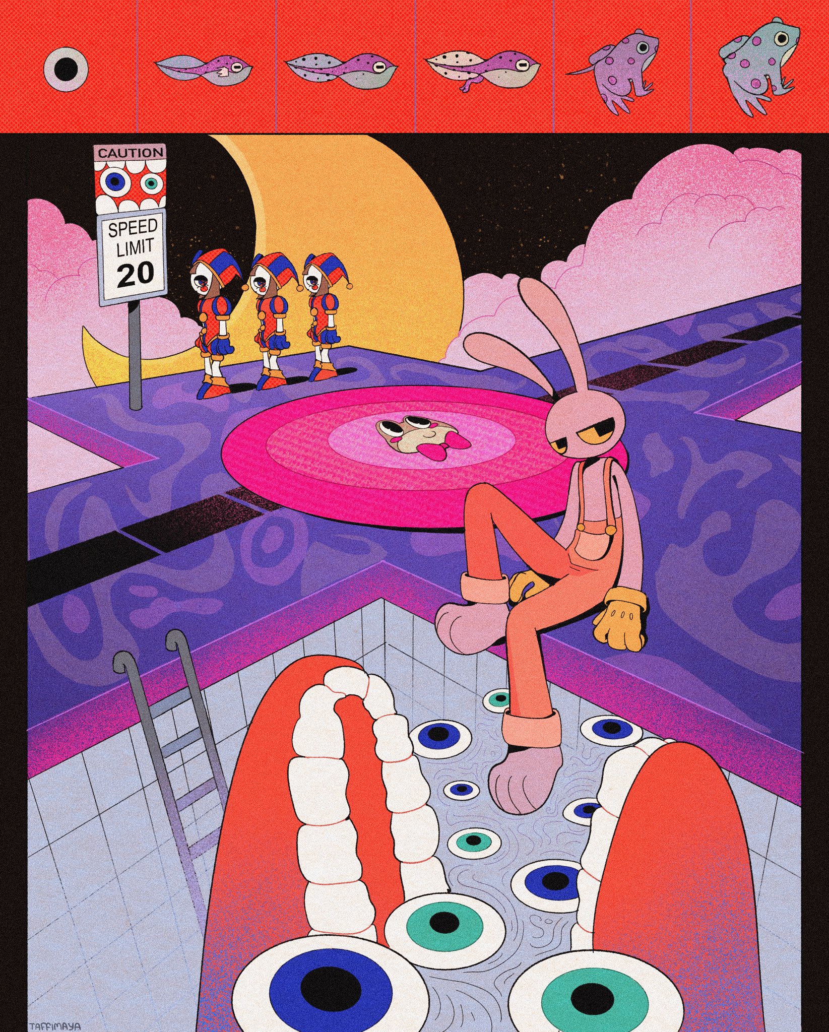 1boy 1girl animal animal_ears animal_feet aqua_eyes artist_name barefoot black_border black_eyes black_sky blue_eyes blue_gloves blue_shirt blue_shoes border brown_hair caine_(the_amazing_digital_circus) carpet clone cloud colored_sclera colored_skin commentary dentures detached_eyes egg empty_pool english_commentary frog gloves half-closed_eyes hat hat_bell highres jax_(the_amazing_digital_circus) jester jester_cap jester_costume ladder moon multicolored_shirt no_mouth no_nose orange_overalls overalls pink_clouds pink_skin pomni_(the_amazing_digital_circus) pool rabbit_boy rabbit_ears red_shirt red_shoes ribbit_(the_amazing_digital_circus) shirt shoes short_sleeves sign sitting sky standing surreal tadpole taffimaya the_amazing_digital_circus two-tone_hat white_skin yellow_gloves yellow_sclera