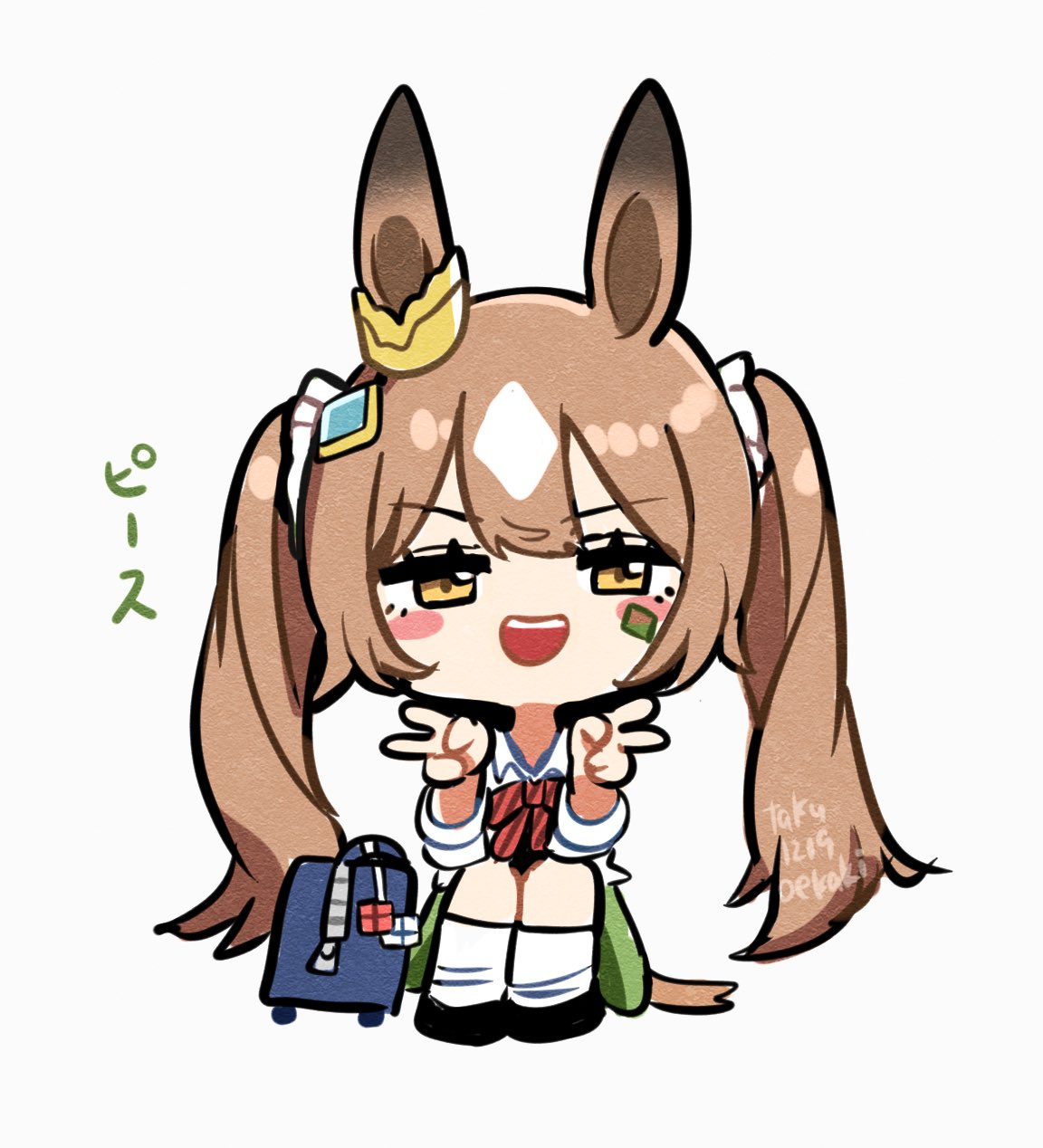 1girl animal_ears bag blush_stickers chibi chibi_only double_v furrowed_brow gyaru highres horse_ears horse_girl horse_tail looking_at_viewer open_mouth satono_diamond_(umamusume) shirt solo squatting tail takuan_(taku1219oekaki) twintails twitter_username umamusume v white_shirt