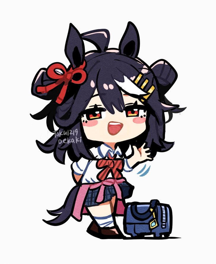 1girl :d animal_ears bag black_hair blush_stickers chibi gyaru horse_ears horse_girl horse_tail kitasan_black_(umamusume) looking_at_viewer open_mouth red_eyes shirt skirt smile solo tail takuan_(taku1219oekaki) teeth twitter_username umamusume upper_teeth_only waving white_background white_shirt