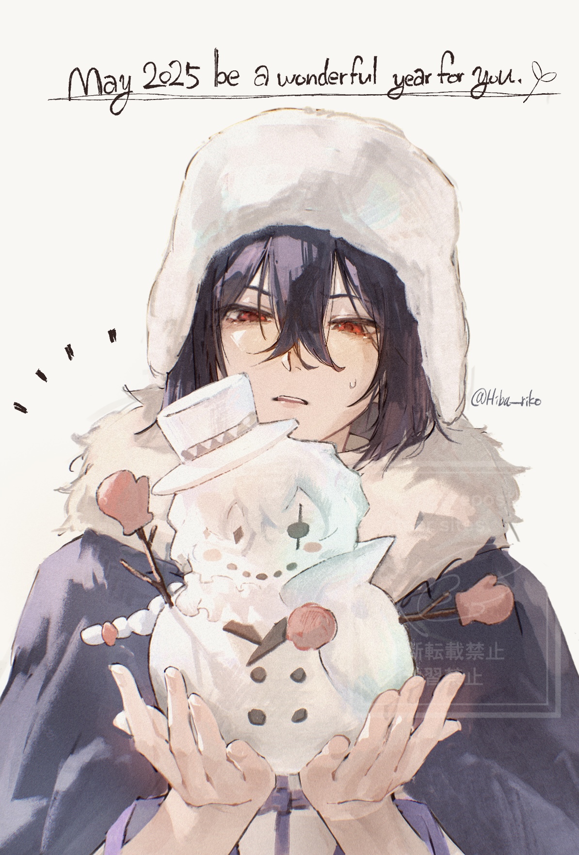 1boy 2025 black_hair bungou_stray_dogs character_snowman coat commentary_request fur-trimmed_coat fur_hat fur_trim fyodor_dostoyevsky_(bungou_stray_dogs) hair_between_eyes hat hiba_riko highres holding_snowman male_focus nikolai_gogol_(bungou_stray_dogs) notice_lines red_eyes short_hair simple_background snowman twitter_username upper_body ushanka watermark white_background
