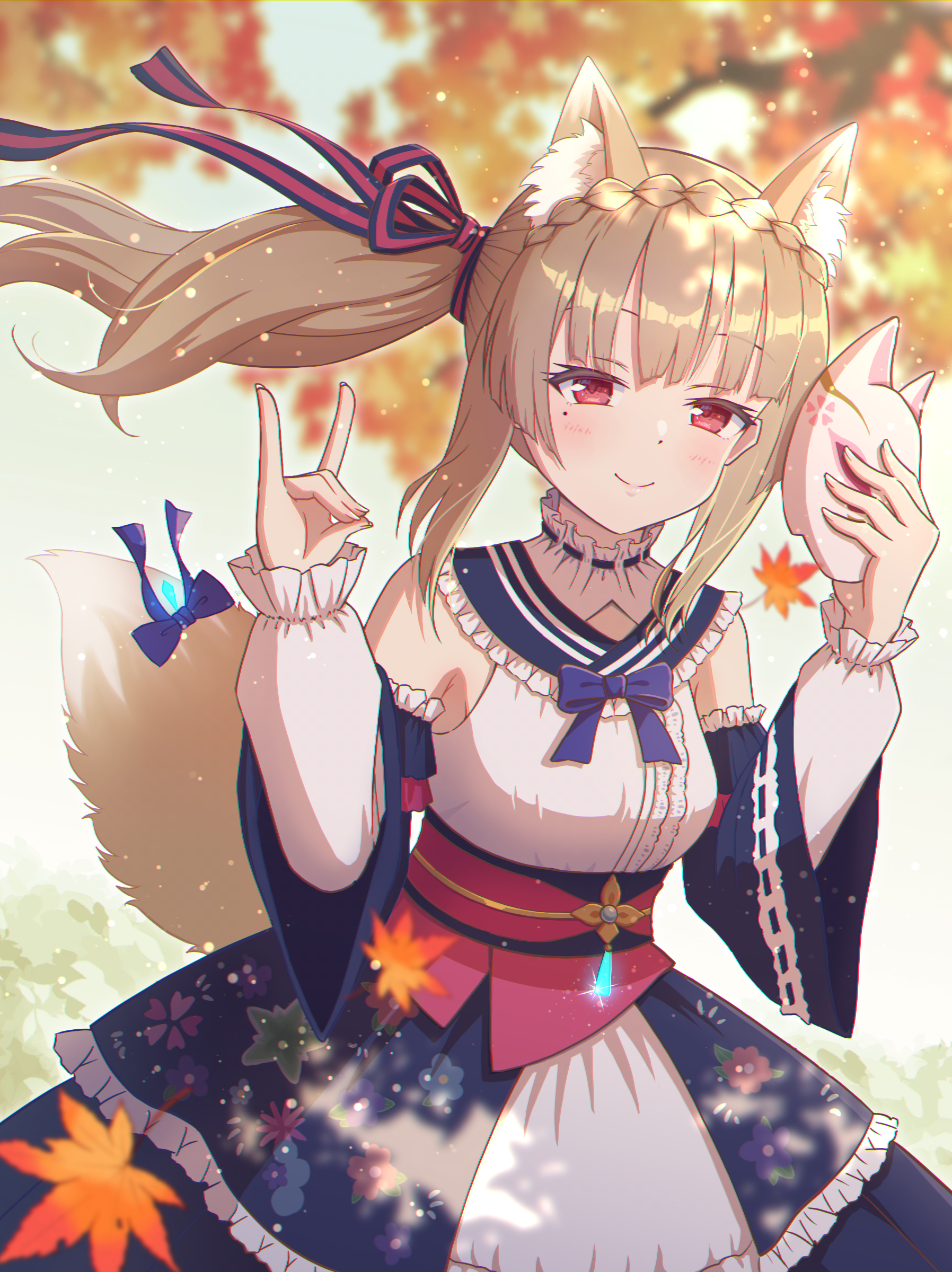 1girl absurdres animal_ear_fluff animal_ears autumn autumn_leaves bare_shoulders black_dress blue_bow blunt_bangs blush bow braid brown_hair closed_mouth commentary_request cowboy_shot crown_braid dappled_sunlight day detached_sleeves dress dress_bow falling_leaves floating_hair fox_ears fox_girl fox_mask fox_shadow_puppet fox_tail frilled_dress frills hair_ribbon hands_up heaven_burns_red highres holding holding_mask japanese_clothes kemonomimi_mode kiryuu_miya leaf light_particles lolita_fashion long_hair long_sleeves looking_at_viewer maple_leaf mask mole mole_under_eye official_alternate_costume official_alternate_hairstyle outdoors ponytail red_eyes red_ribbon red_sash ribbon sash sidelocks sizmaru11 smile solo sunlight tail wa_lolita wide_sleeves