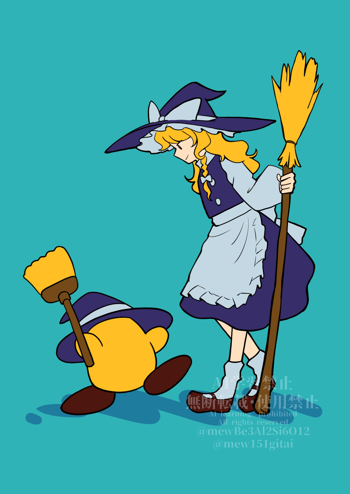 1girl apron black_skirt black_vest blonde_hair blue_background bow braid broom broom_hatter brown_shoes closed_mouth commentary_request crossover hair_bow hat hat_bow highres holding holding_broom kirby_(series) kirisame_marisa long_hair long_sleeves mewbe3al2si6o12 nintendo puffy_sleeves shadow shoes simple_background skirt smile socks touhou trait_connection twitter_username vest watermark white_apron white_bow white_socks witch_hat