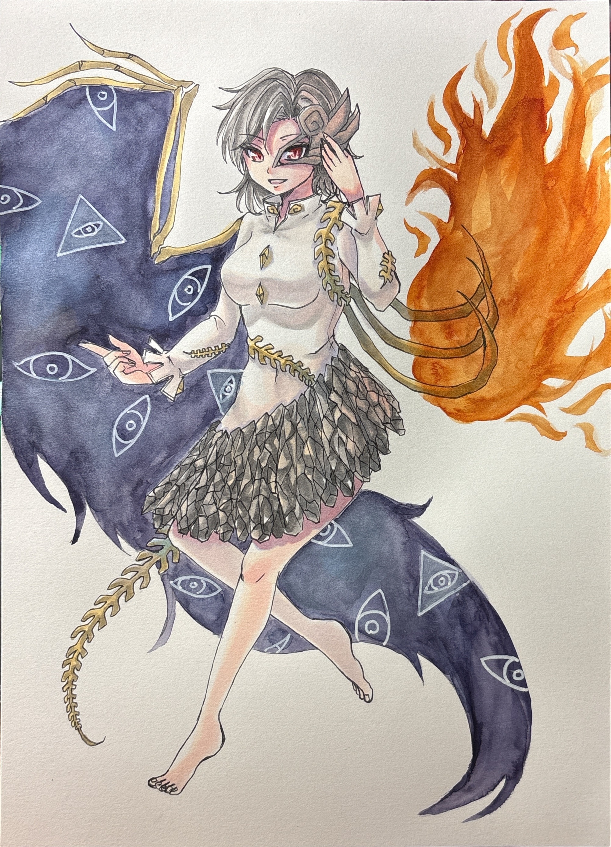 1girl absurdres asymmetrical_wings barefoot breasts brown_hair brown_mask commentary_request eye_print fiery_wings half_mask hand_on_mask highres iwanaga_ariya long_sleeves mask mask_over_one_eye medium_breasts mitsu~ red_eyes shirt skeletal_clothes skeletal_tail skeletal_wings solo tail toes touhou translation_request white_shirt wings