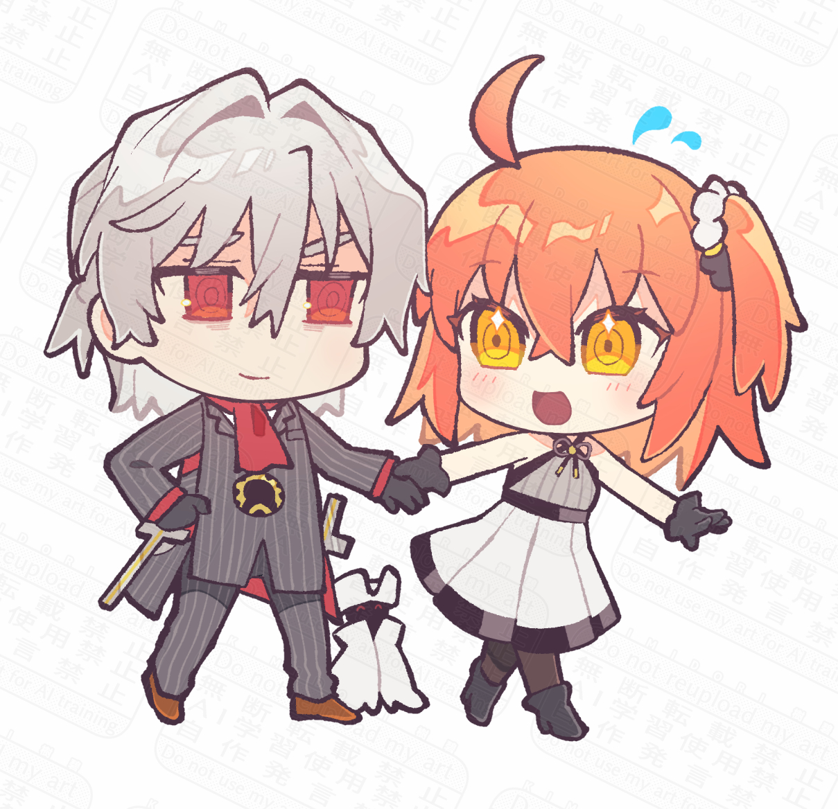 1boy 1girl ahoge antonio_salieri_(fate) antonio_salieri_(second_ascension)_(fate) black_gloves black_shoes chibi commentary_request couple cross fate/grand_order fate_(series) flying_sweatdrops formal_clothes fujimaru_ritsuka_(female) fujimaru_ritsuka_(female)_(waltz_in_the_moonlight/lostroom) full_body gloves grey_hair grey_pantyhose grey_shirt grey_suit hand_on_own_hip hetero holding_hands kimidorix32 long_sleeves one_side_up orange_hair pantyhose pinstripe_pattern pinstripe_suit red_eyes red_shoes shirt shoes short_hair skirt sleeveless sleeveless_shirt smile suit watermark white_skirt yellow_eyes