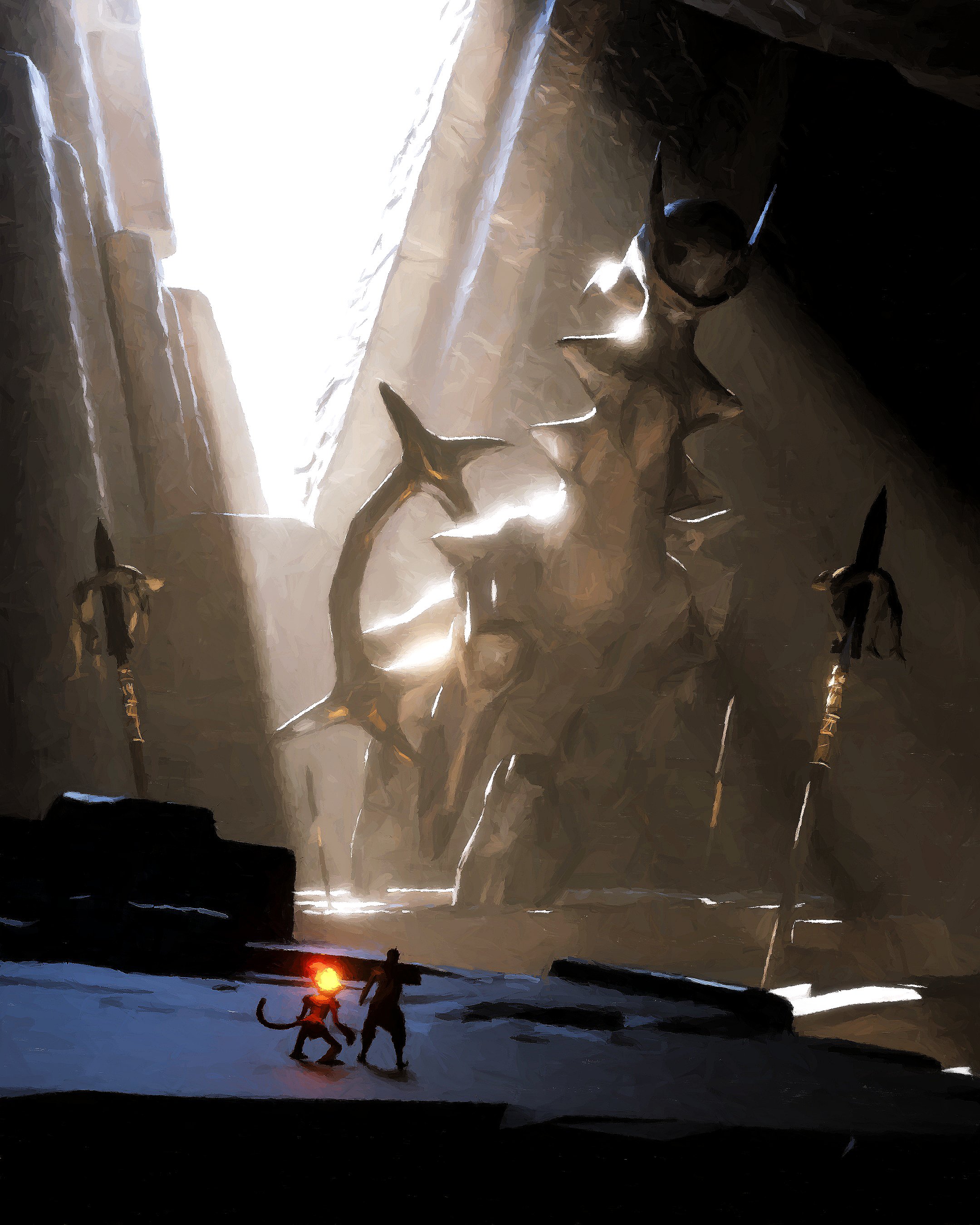 absurdres arceus commentary english_commentary fiery_hair fire gen_4_pokemon highres horns huge_weapon infernape legendary_pokemon light_rays monkey mythical_pokemon nintendo pokemon pokemon_(creature) polearm rivalclay ruins spear spikes standing statue sunbeam sunlight weapon