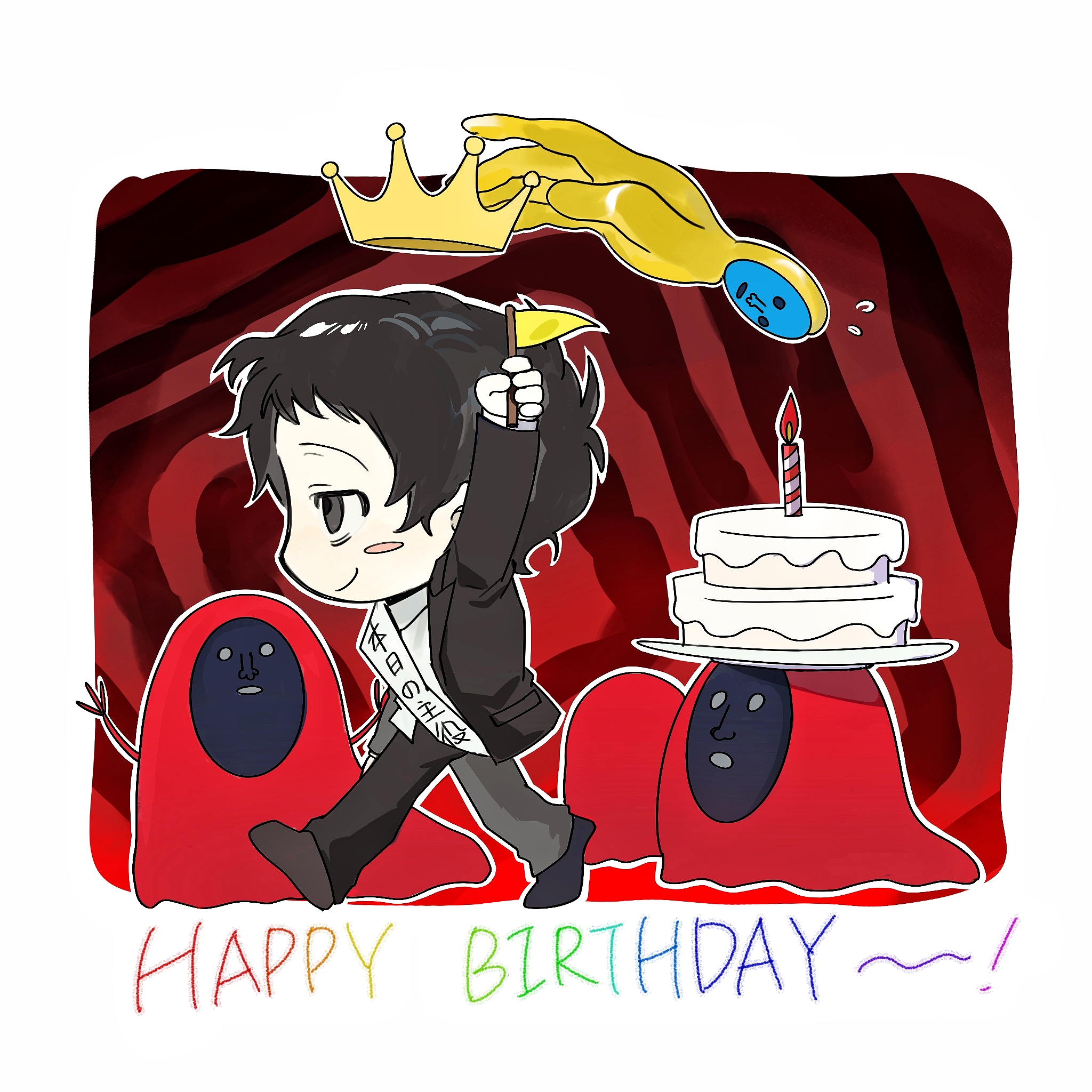 1boy adachi_tooru arm_up birthday_cake black_eyes black_hair black_jacket black_pants blush_stickers border cake chengmingraven chibi chibi_only commentary crown dated_commentary flag food from_side happy_birthday highres holding holding_flag jacket male_focus pants persona persona_4 sash shadow_(persona) short_hair smile translation_request walking white_border
