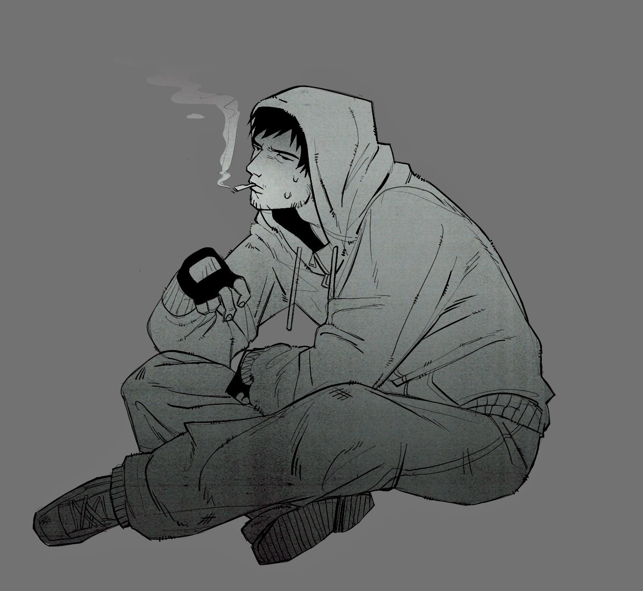 1boy black_gloves black_hair crossed_legs cry_of_fear elbows_on_knees facial_hair fingerless_gloves full_body gloves goatee_stubble grey_hoodie greyscale hand_on_lap head_tilt highres hood hood_up hoodie looking_at_viewer male_focus monochrome short_hair simon_henriksson sitting smoke smoke_trail smoking solo stubble sweatdrop tac_nyanx3