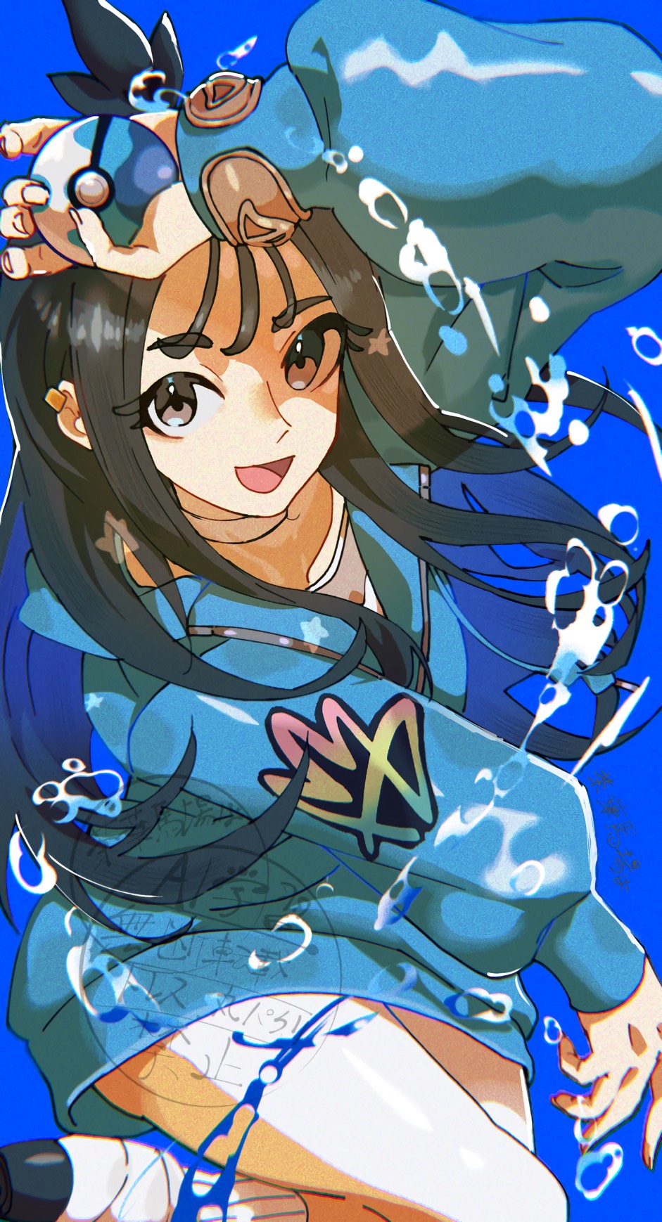 1girl black_hair blue_hoodie chayo_bababa choker commentary_request dive_ball earclip grey_eyes hair_ornament highres holding holding_poke_ball hood hood_down hoodie jacket leggings lida_(pokemon) long_hair long_sleeves looking_at_viewer mega_ring nintendo open_mouth orange_leggings poke_ball pokemon pokemon_legends:_z-a ribbed_socks smile socks solo topknot two-tone_legwear water white_choker white_leggings wispy_bangs