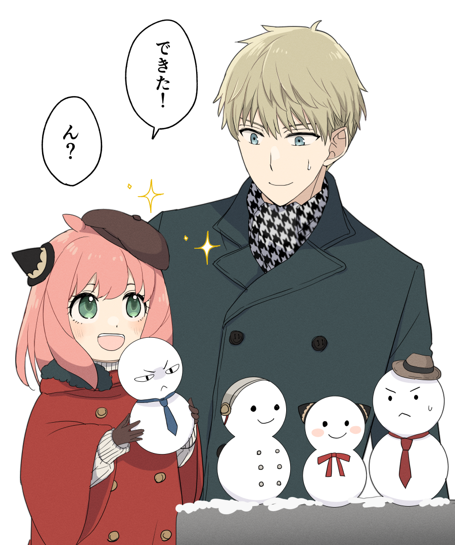 1boy 1girl :d ahoge anya_(spy_x_family) blonde_hair blue_eyes blush brown_gloves brown_hat buttons character_snowman child closed_mouth coat commentary_request double-breasted family_bonding father_and_daughter gloves green_coat green_eyes hairpods hat holding_snowman hood hood_down hooded_coat long_sleeves looking_at_another medium_hair mello79 open_mouth pink_hair red_coat scar short_hair simple_background smile snow snowman speech_bubble spy_x_family twilight_(spy_x_family) upper_body very_short_hair white_background wide_sleeves yor_briar yuri_briar