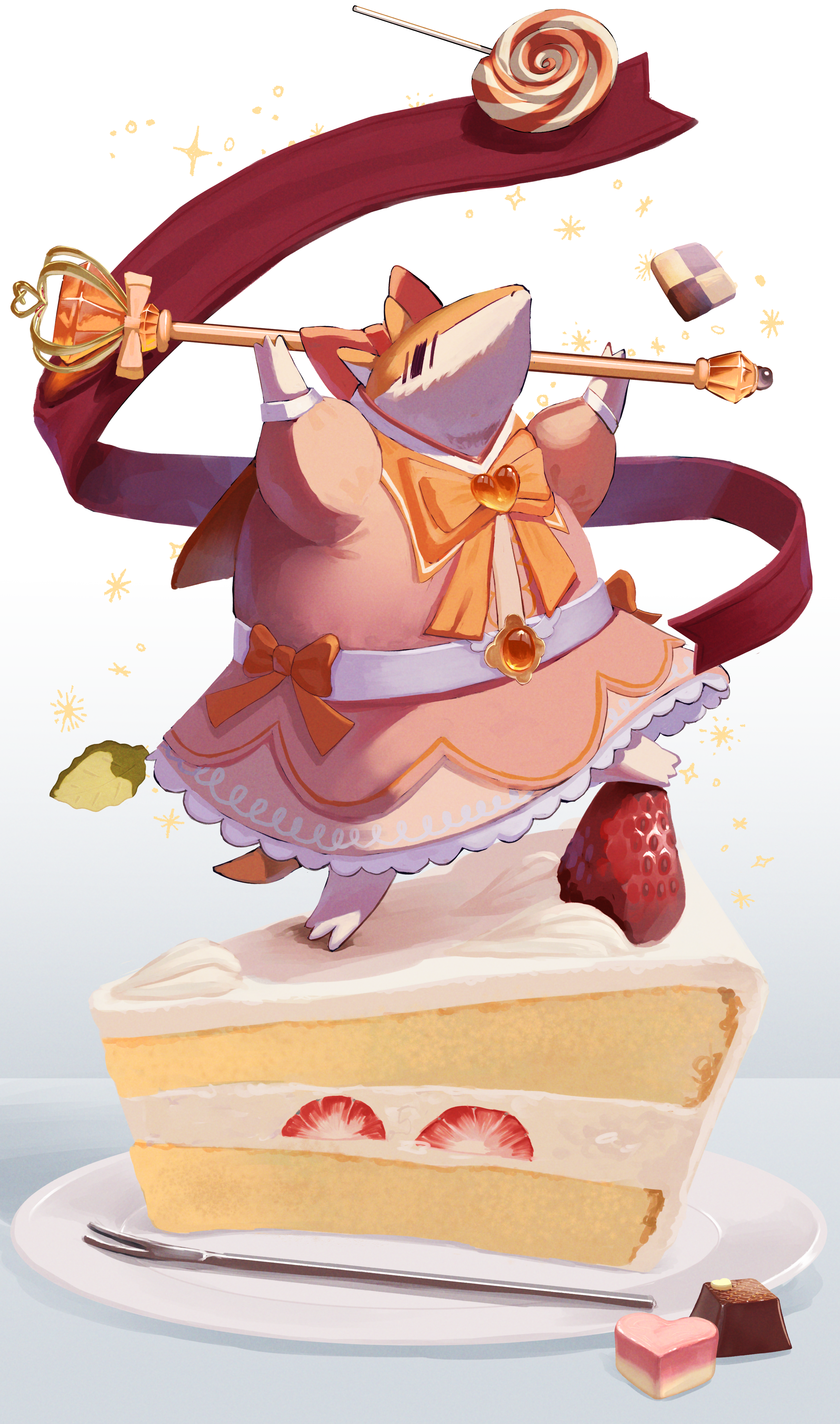 absurdres animal armadillo bow cake cake_slice candy checkerboard_cookie clothed_animal commentary_request cookie dress food fork full_body highres holding holding_scepter john_(kyuuketsuki_sugu_shinu) kyuuketsuki_sugu_shinu lollipop magurosamm no_humans on_food pink_bow pink_dress plate red_bow scepter solo swirl_lollipop