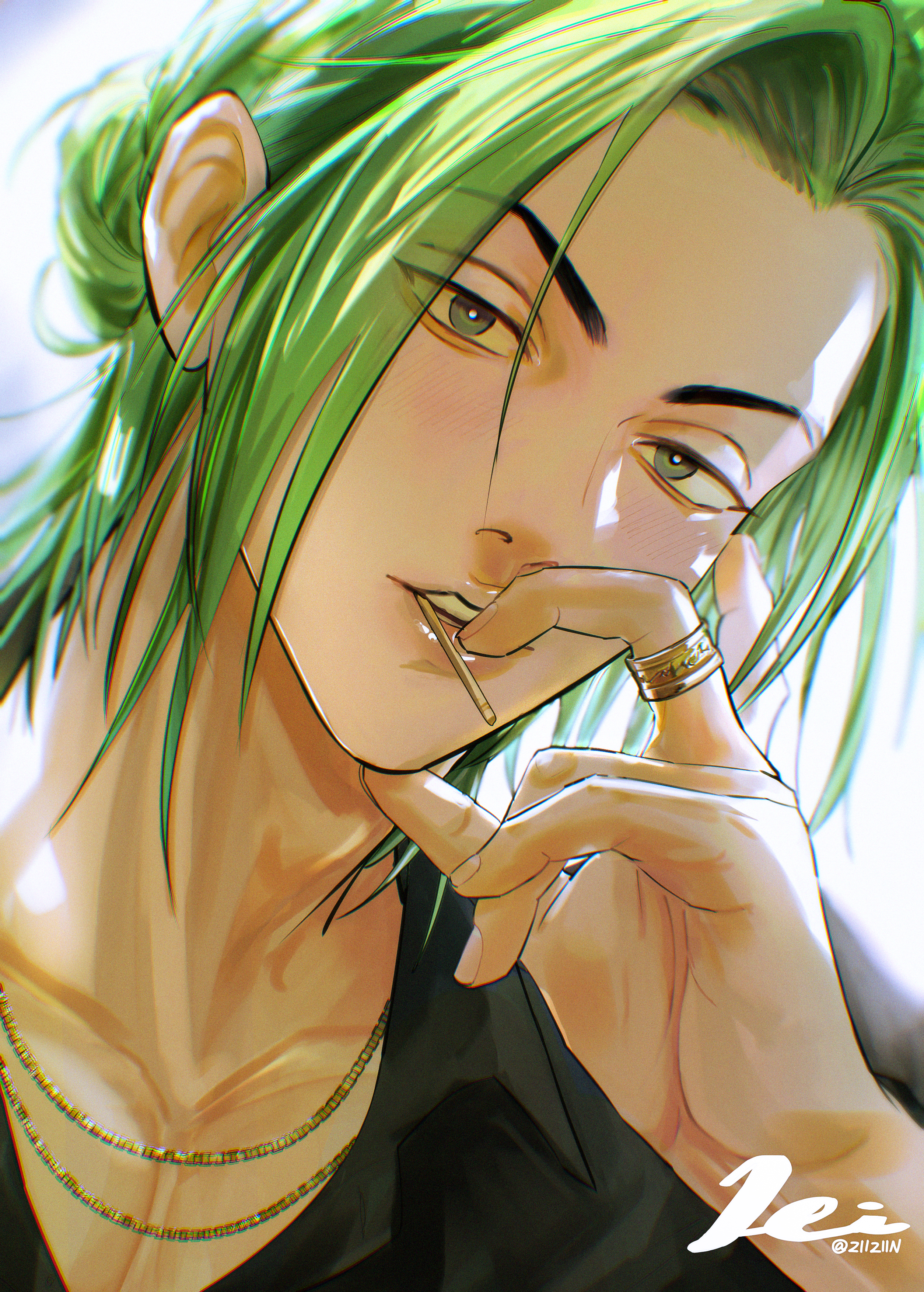 1boy 211211n absurdres adam's_apple artist_name backlighting black_shirt blurry blurry_edges chromatic_aberration collarbone collared_shirt commentary_request curtained_hair depth_of_field everyday_host film_grain fingernails gold_necklace gold_ring green_eyes green_hair half_up_bun half_updo hand_on_own_face hand_up head_tilt highres jewelry light_blush long_bangs looking_at_viewer male_focus medium_hair mismatched_eyebrows mouth_hold multiple_necklaces necklace parted_bangs parted_lips pectoral_cleavage pectorals portrait sauce_nishioka shiny_lips shirt solo twitter_username white_background