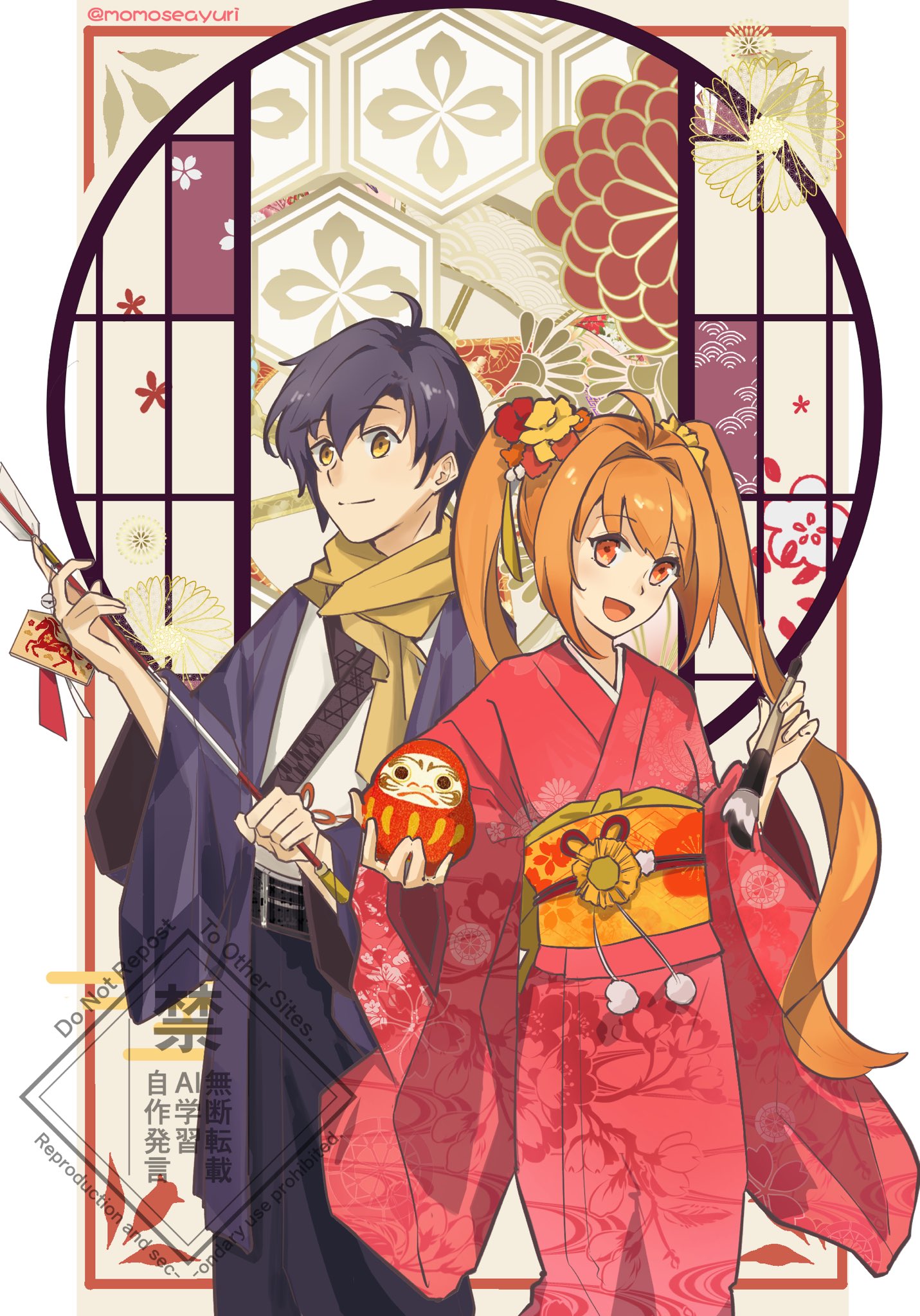1boy 1girl ahoge antenna_hair arrow_(projectile) black_hair border calligraphy_brush closed_mouth commentary_request daruma_doll doll double-parted_bangs eiyuu_densetsu ema english_text estelle_bright floating_hair floral_print floral_print_kimono flower furisode hair_between_eyes hair_flower hair_intakes hair_ornament hakama hakama_skirt hamaya highres holding holding_arrow holding_calligraphy_brush holding_doll holding_paintbrush japanese_clothes joshua_bright kimono long_hair looking_at_viewer momoseayuri new_year obi obijime open_mouth paintbrush parted_bangs print_kimono red_eyes sash scarf short_hair skirt smile sora_no_kiseki twintails twitter_username upper_body very_long_hair watermark white_border wide_sleeves yellow_eyes yellow_scarf