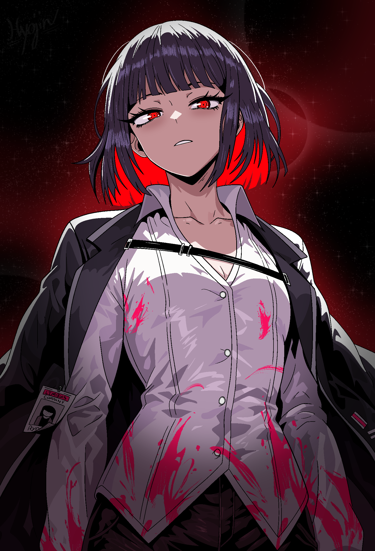 1girl black_coat black_hair black_pants blood blood_on_clothes breasts cleavage_cutout clothing_cutout coat coat_on_shoulders collarbone collared_shirt colored_inner_hair commentary from_below glowing glowing_eyes highres hyojin_en id_card light_particles limbus_company looking_at_viewer multicolored_hair pants project_moon red_eyes red_hair ryoshu_(project_moon) shirt short_hair small_breasts solo two-tone_hair white_shirt