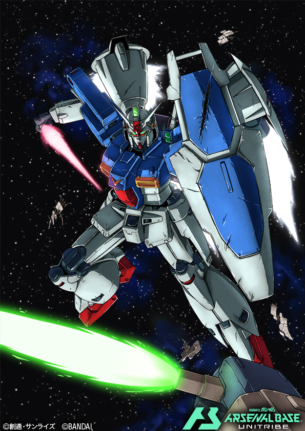 commentary_request copyright_logo copyright_name copyright_notice daue energy_sword green_eyes gundam gundam_0083 gundam_arsenal_base gundam_gp-01_full_vernian_zephyranthes holding holding_beam_saber holding_shield holding_sword holding_weapon logo mecha mobile_suit no_humans official_art pov pov_hands robot science_fiction shield space sword thrusters v-fin weapon