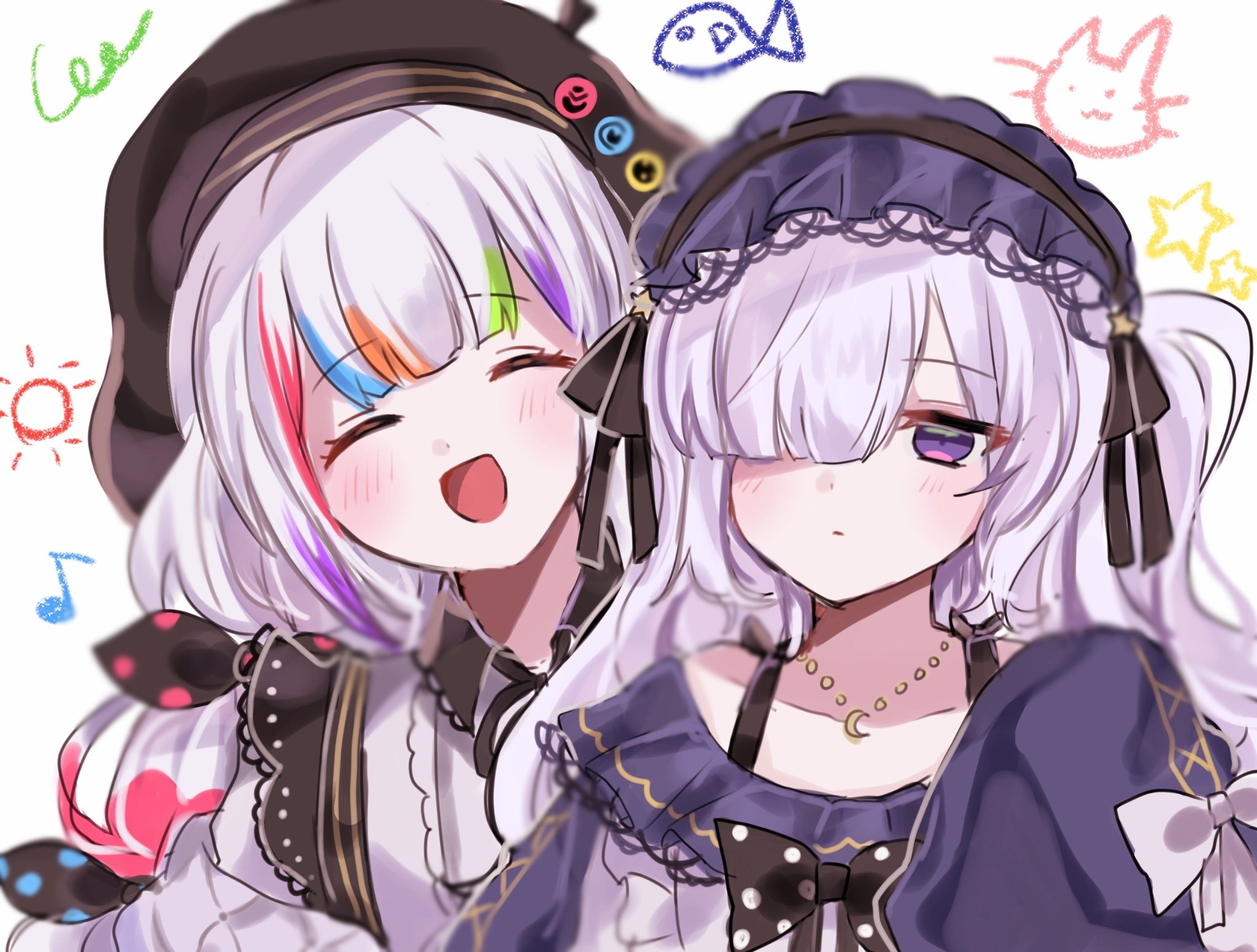 2girls :d black_ribbon blue_hairband bow closed_eyes crescent crescent_necklace gothic_lolita hair_over_one_eye hair_ribbon hairband highres jewelry jogasaki_noah lolita_fashion lolita_hairband long_hair long_sleeves looking_at_viewer mahou_shoujo_no_majo_saiban multi-tied_hair multicolored_hair multiple_girls musical_note natsume_an-an necklace one_side_up open_mouth polka_dot polka_dot_bow purple_eyes ribbon smile star_(symbol) streaked_hair tosiosito upper_body white_background white_hair