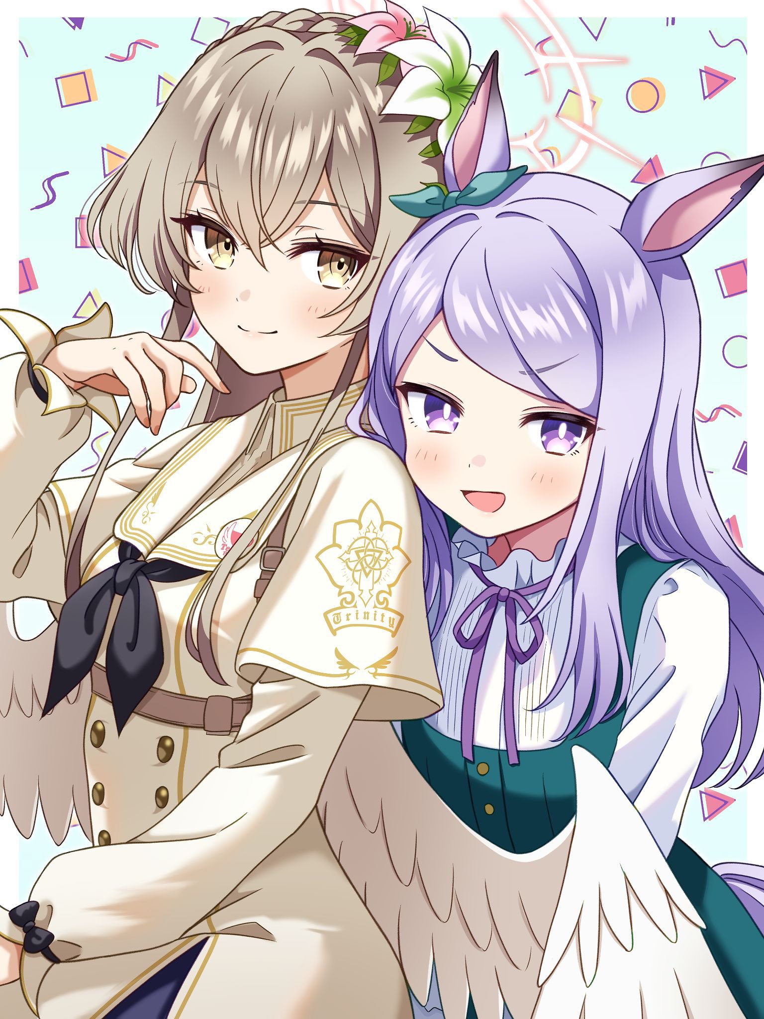 2girls :d angel_wings animal_ears aqua_bow black_bow black_neckerchief blue_archive blush bow bowtie brown_eyes brown_hair buttons capelet collar commentary_request crossover dress ear_bow feathered_wings flower frilled_collar frills gesupi_(provlemsolver57) green_dress hair_flower hair_ornament halo head_on_another's_shoulder highres horse_ears horse_girl horse_tail long_hair long_sleeves low_wings mejiro_mcqueen_(casual)_(umamusume) mejiro_mcqueen_(umamusume) multiple_girls nagisa_(blue_archive) neckerchief official_alternate_costume ojou-sama_pose open_mouth patterned_background pinafore_dress pink_halo purple_bow purple_bowtie purple_eyes purple_hair shirt shrug_(clothing) sleeveless sleeveless_dress smile split_mouth tail trinity_general_school_logo umamusume upper_body white_background white_capelet white_dress white_shirt white_shrug white_wings wings