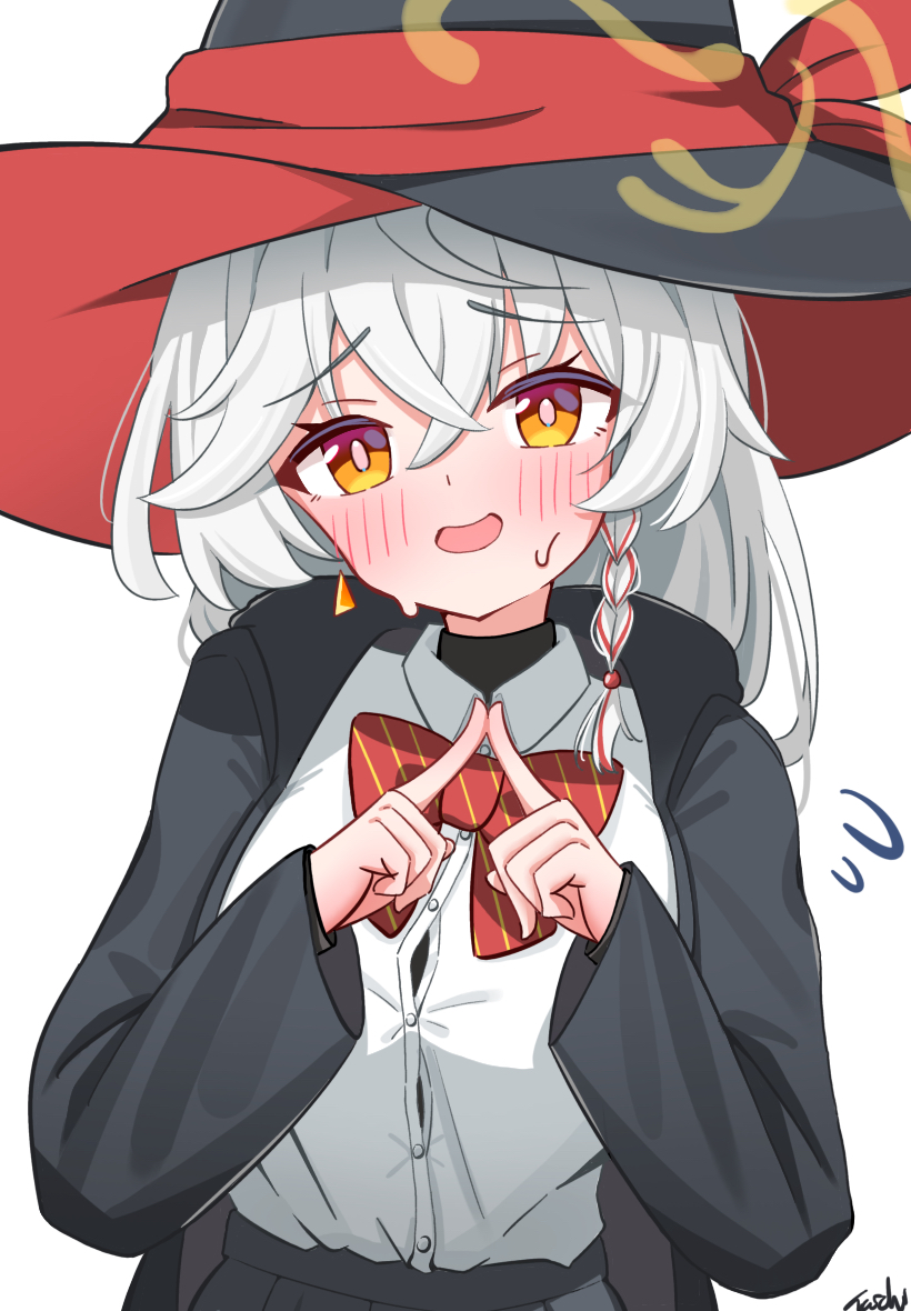 1girl black_jacket black_skirt blue_archive blush bow braid breasts collared_shirt commentary_request diagonal-striped_bow diagonal-striped_clothes earrings eri_(blue_archive) hair_between_eyes halo hat hat_ribbon jacket jewelry large_breasts long_hair long_sleeves looking_at_viewer open_mouth orange_eyes orange_halo pleated_skirt red_bow red_ribbon ribbon shirt simple_background single_earring skirt smile solo striped_bow striped_clothes taichi_(taichi_bookcafe) tilted_halo white_background white_hair white_shirt witch_hat