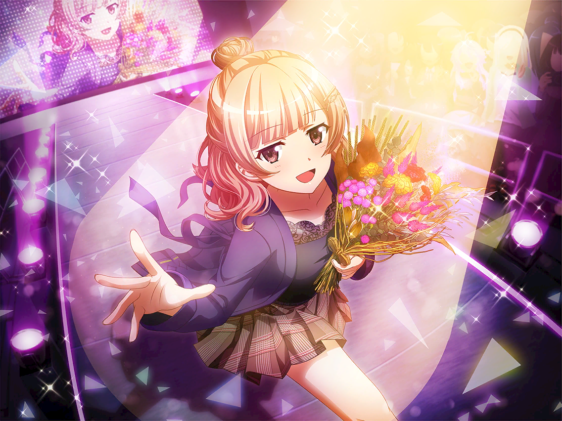 1girl black_shirt bouquet brown_hair brown_skirt collarbone crowd flower game_cg hair_bun hair_ornament hairclip half_up_bun holding holding_bouquet jacket long_sleeves looking_at_viewer official_art open_clothes open_jacket open_mouth purple_jacket red_eyes screen shadow shirt short_hair shoujo_kageki_revue_starlight shoujo_kageki_revue_starlight_-re_live- skirt solo spotlight stage_lights tanaka_yuyuko walking