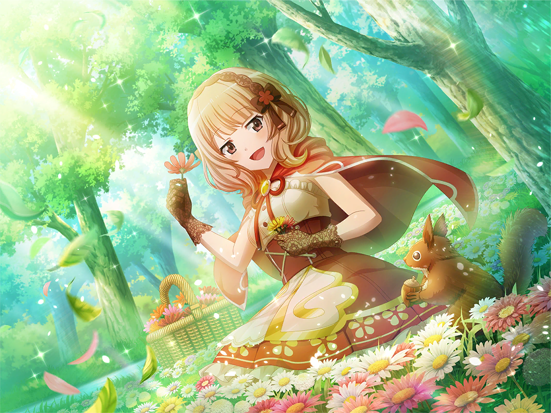 1girl basket blonde_hair blunt_bangs brown_corset brown_eyes cloak corset cosplay dress dutch_angle falling_leaves flower flower_request game_cg gloves hairband holding holding_flower lace lace_gloves leaf light_rays little_red_riding_hood_(fairy_tale) little_red_riding_hood_(fairy_tale_character) little_red_riding_hood_(fairy_tale_character)_(cosplay) looking_at_viewer official_art open_mouth petals red_cloak short_hair shoujo_kageki_revue_starlight shoujo_kageki_revue_starlight_-re_live- sitting solo squirrel tanaka_yuyuko tree upper_body white_dress