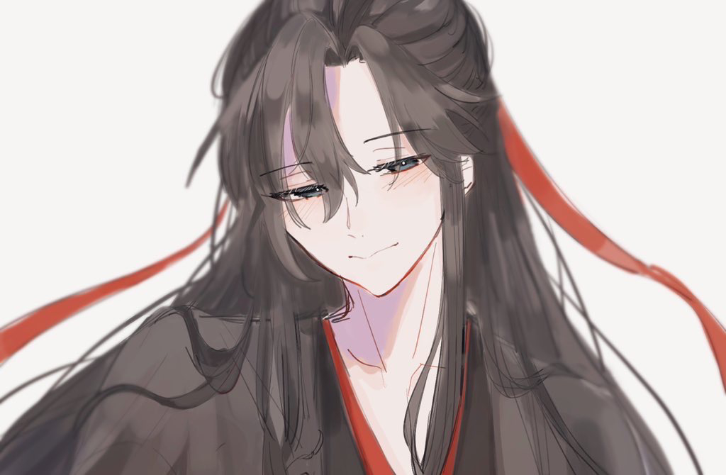 1boy bishounen black_hair black_hanfu blush chinese_clothes closed_mouth coat commentary_request grey_coat grey_eyes hair_down hair_ribbon half_updo hanfu long_hair looking_at_viewer male_focus modao_zushi nekohashi_ru official_alternate_costume official_alternate_hairstyle open_clothes open_coat red_ribbon ribbon robe sidelocks simple_background smile solo upper_body wei_wuxian wei_wuxian_(yiling_laozu) white_background