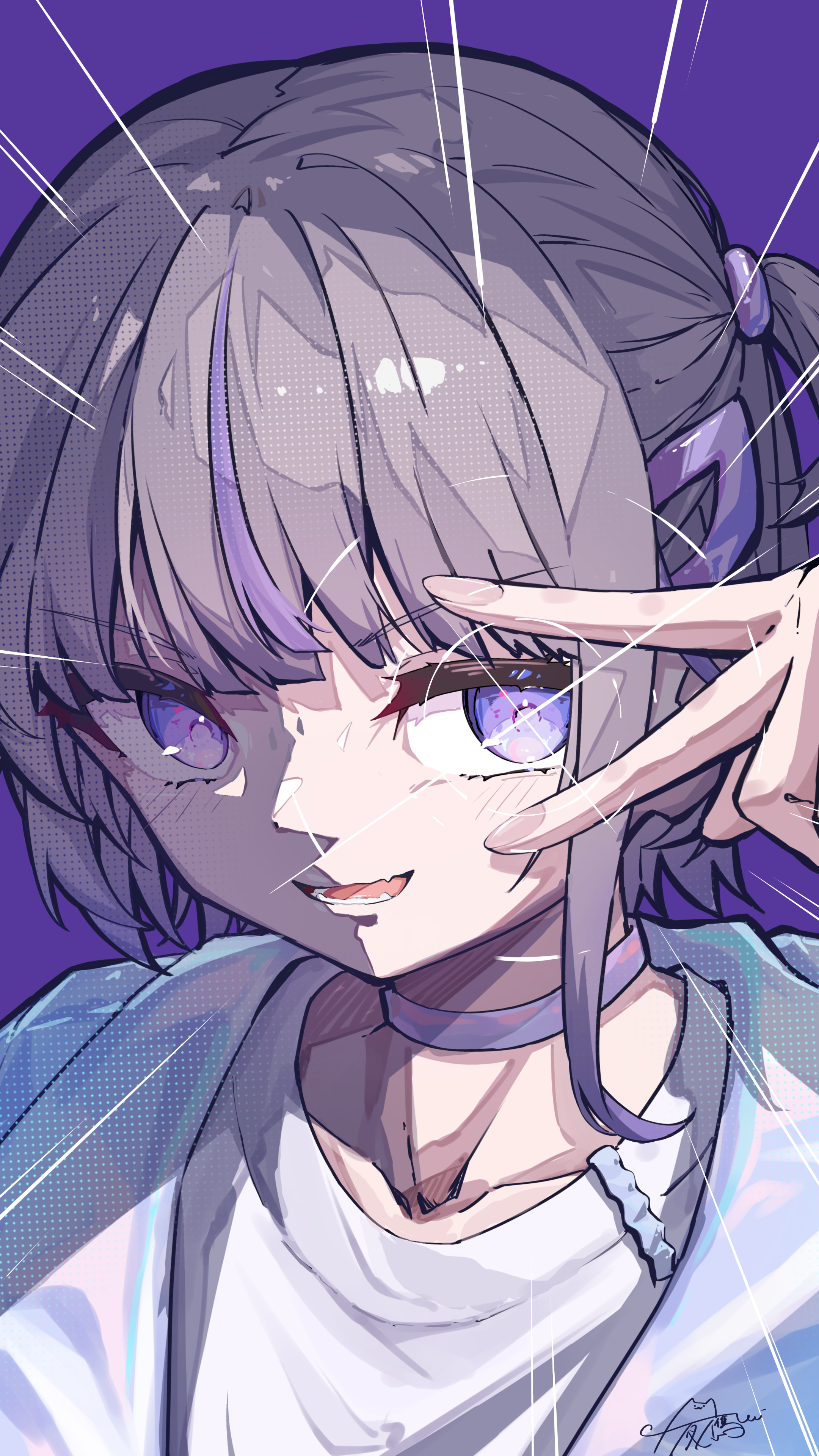 absurdres blonde_hair choker commentary hair_ornament hairpin highres hololive hololive_dev_is jacket looking_at_viewer medium_hair multicolored_hair purple_background purple_eyes purple_streaks shirt smile solo streaked_hair todoroki_hajime todoroki_hajime_(1st_costume) two_side_up u_da_desu virtual_youtuber white_choker white_jacket white_shirt