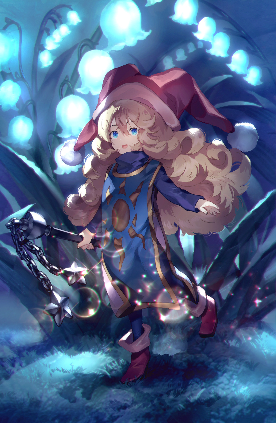 1girl blonde_hair blue_eyes blue_flower blue_tabard boots bubble charlotte_(seiken_densetsu_3) commentary_request curly_hair flail flower full_body gold_trim hair_between_eyes hat highres holding holding_flail holding_weapon jester_cap long_hair open_mouth pom_pom_hat_ornament red_boots red_hat seiken_densetsu seiken_densetsu_3 smile solo sunakumo tabard weapon