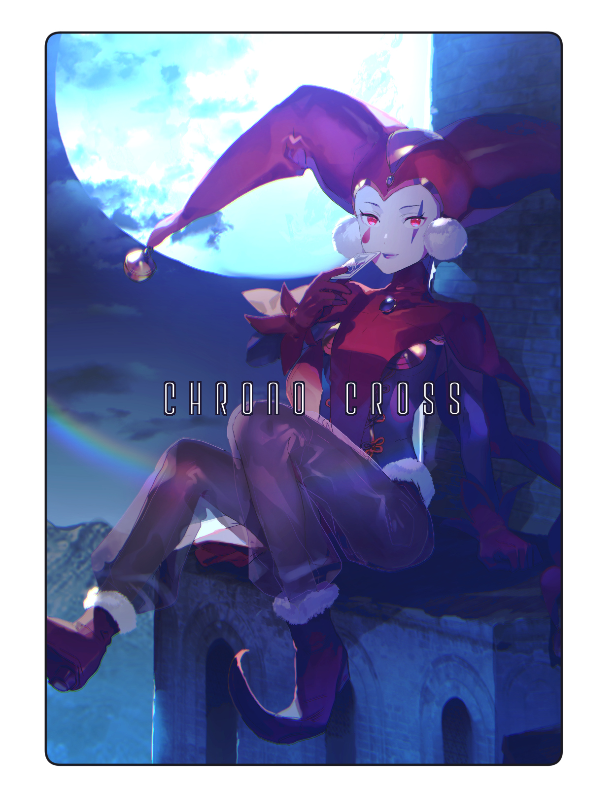 1girl black_leotard breasts card chrono_cross commentary_request copyright_name earrings facepaint facial_mark foot_out_of_frame full_moon fur-trimmed_leotard fur_trim gloves harle_(chrono_cross) hat highres holding holding_card jester_cap jewelry leotard medium_breasts moon pants pointy_shoes pom_pom_(clothes) pom_pom_earrings red_eyes red_gloves red_hat red_shoes see-through_clothes see-through_pants shoes sitting solo sunakumo teardrop_facial_mark
