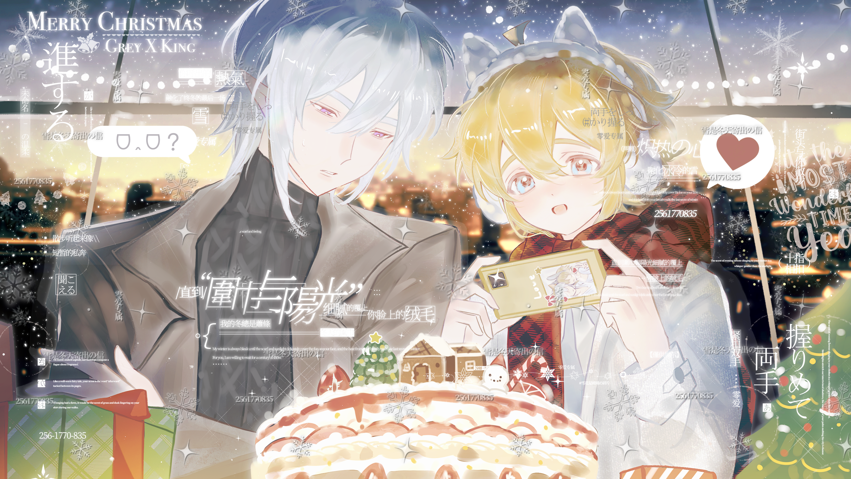 2boys absurdres alternate_costume animal_ear_hairband animal_ears aotu_world bishounen black_sweater blonde_hair blue_eyes blush box brown_coat cake camera cat_ear_hairband cat_ears cellphone chinese_commentary christmas christmas_cake christmas_tree coat commentary_request crossed_arms earmuffs fake_animal_ears food gift gift_box grey_(aotu_world) grey_hair hairband heart highres holding holding_phone indoors jacket king_(aotu_world) long_sleeves looking_at_another looking_down male_focus merry_christmas multiple_boys night open_box open_mouth parted_lips phone plutoray pointy_ears purple_eyes red_scarf scarf shirt short_hair smartphone smile snowing sparkle spoken_expression spoken_heart sweater taking_picture turtleneck watermark watermark_grid white_hair white_jacket white_shirt window winter winter_clothes yaoi