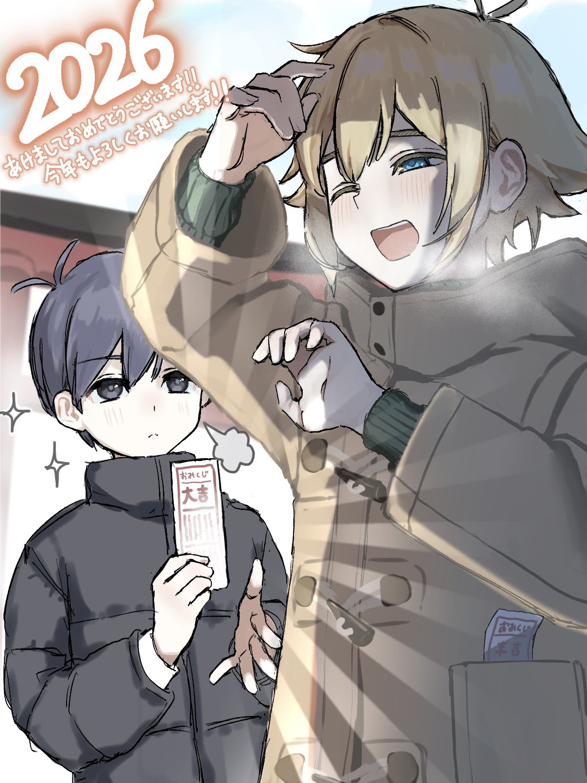 2026 2boys alternate_costume antenna_hair arm_up basil_(faraway)_(omori) basil_(omori) black_coat black_eyes black_hair blonde_hair blue_eyes blush brown_coat ccn_ncc3 closed_mouth coat commentary_request double-parted_bangs hair_between_eyes highres long_sleeves looking_at_another male_focus multiple_boys omori one_eye_closed open_mouth short_hair sidelocks smile sunny_(omori) teeth tongue torii translation_request upper_teeth_only