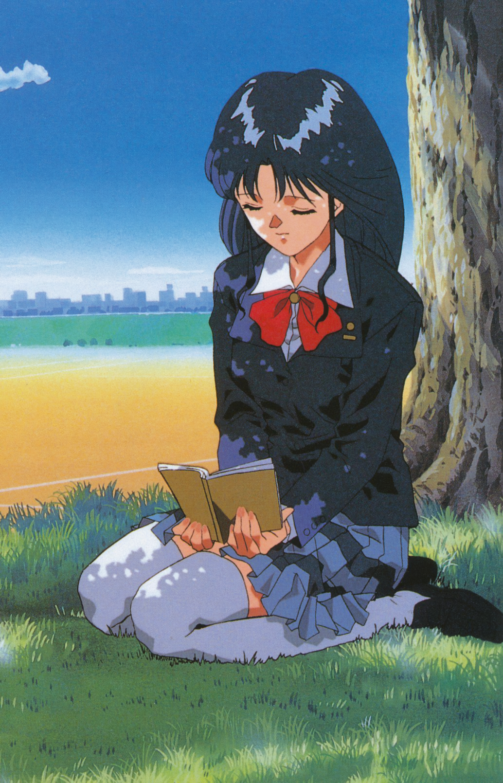 1990s_(style) 1girl black_shoes blazer blue_hair blue_jacket blue_skirt book closed_eyes dappled_sunlight day fujiwara_aya highres holding holding_book jacket long_hair long_sleeves non-web_source official_art open_book outdoors pleated_skirt retro_artstyle scan school_uniform shoes sitting skirt solo striped_clothes striped_skirt sunlight super_real_mahjong thighhighs wariza white_thighhighs